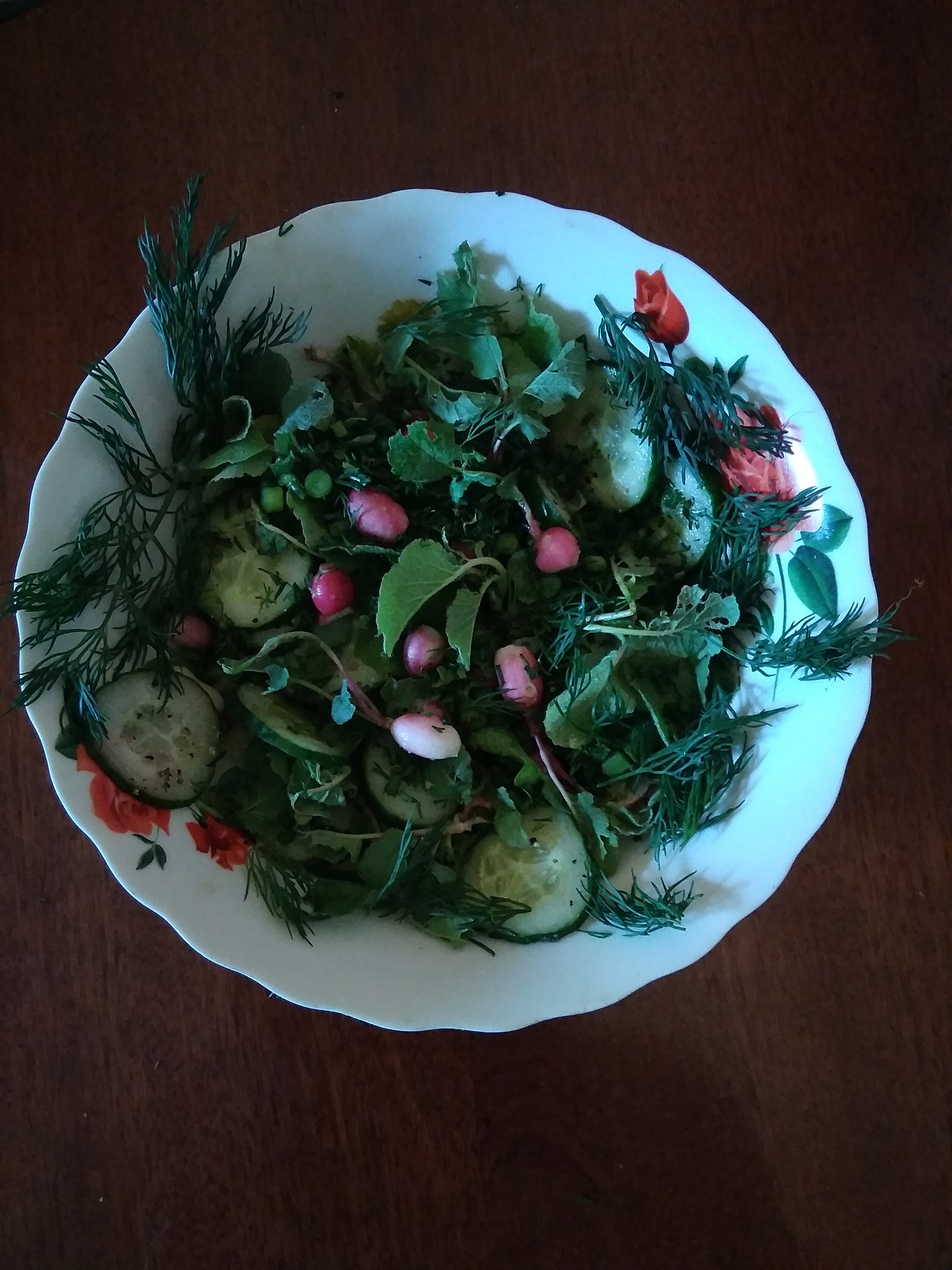 Взял я этот урожай, домой привез, помыл, а сегодня соорудил вот такой салат. Огурчик, мини редиска с ботвой, укропчик, чуть-чуть соли и растительного масла. Черный перчик и кориандр - это святое! Получилось волшебно. И, на мой взгляд красиво.  Витамины шевелились в тарелке и норовили уползти. Но им это не удалось.