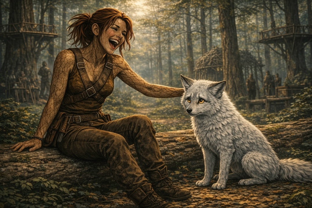 Не успел Элвин перевести дух после ухода Корна Далета, как на поляну легкими шагами вышла Вейла Рунница – советница, искусная в магии рун. Она выглядела молодо и даже озорно, несмотря на солидный возраст. Стройная, сухощавая, с овальным лицом и матовой кожей с едва заметной древесной текстурой. Рыже-каштановые волосы были собраны в практичный хвост, одежда — короткая туника, штаны, ремни с подсумками и инструментами — говорила о ней красноречивее любых титулов: перед Элвином стоял не символ и не жрица, а человек дела, привыкший думать и принимать решения. Глаза Вейлы светились бледно-зелёным, мягким, но проницательным огнем. В выражении – спокойствие и сосредоточенность учёного, хотя в уголках губ играла улыбка. Вейла приблизилась к клети, и руны Лозы проступили на коже дриады, слабо замерцав – так магия леса отзывалась на присутствие чужеродного колдовства.