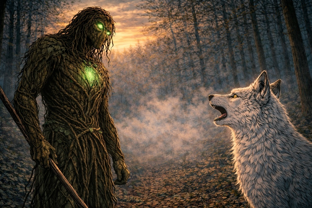Из зарослей показались пятеро лесных стражей в лёгких доспехах из многослойной кожи и плетений лозы. Перед пятеркой бойцов двигалась высокая темная фигура, больше похожая на сплетение растений, принявших облик воина. Корн Далет – глава Корпуса Разведки и Тайного Сыска Северо-восточной Ветви Зеленого Предела. Корн шагал размеренно, опираясь на длинное древковое оружие, напоминавшее копье и серп одновременно. Его тело было словно сплетено из лоз и плюща, принявших очертания человека. В груди мерцало изумрудное кристаллическое сердце, пульсирующее в такт лесу — источник древней силы, связующий Корна с самим Пределом. Маска из коры с двумя глубокими глазницами закрывала лицо; когда он поворачивал голову, в этих прорезях вспыхивали короткие зелёные отблески.