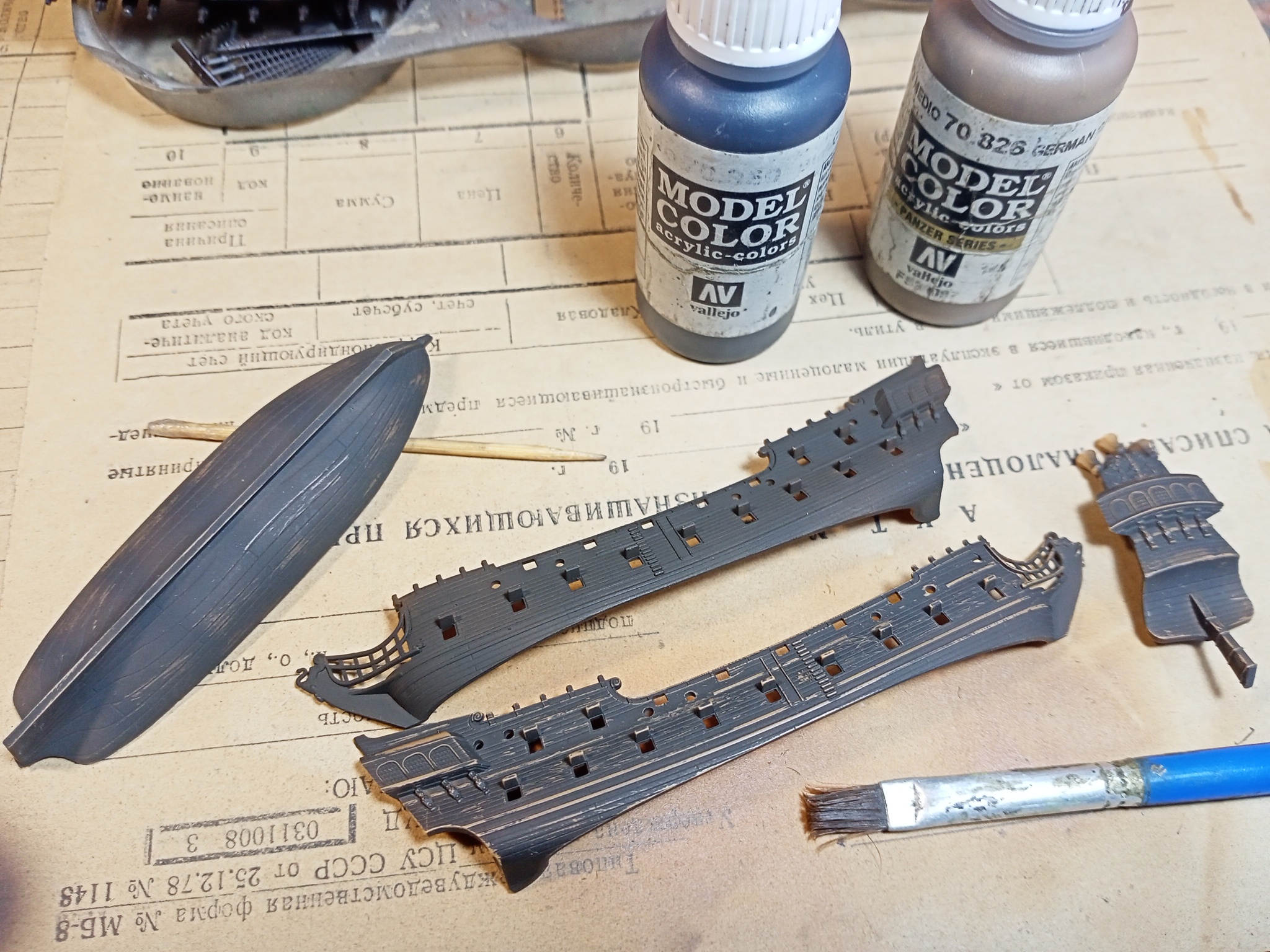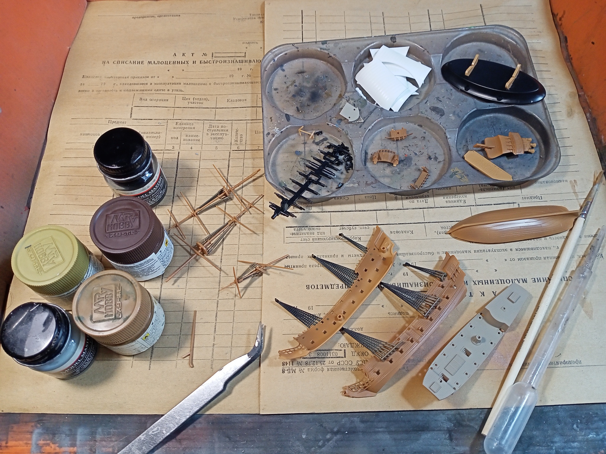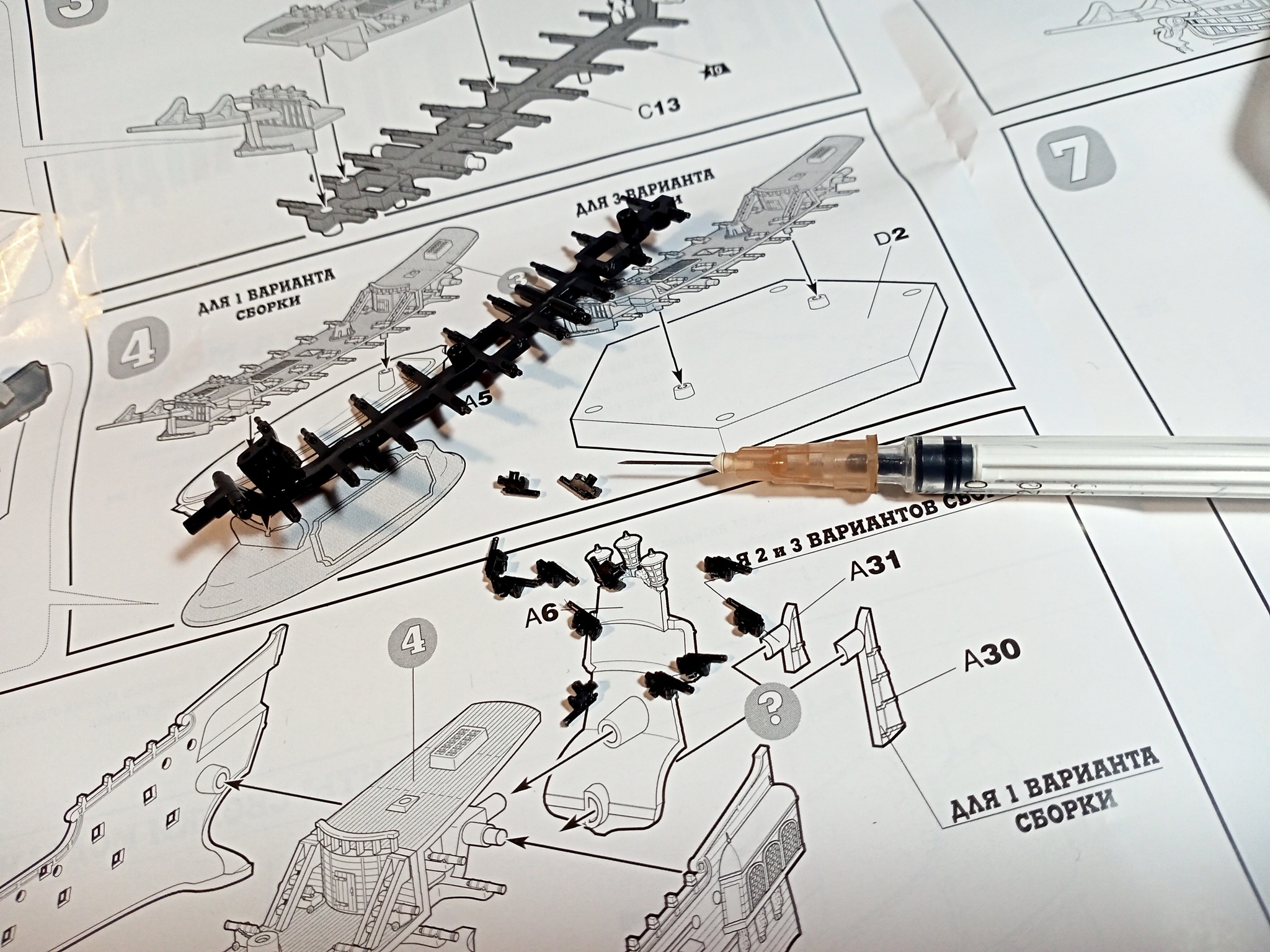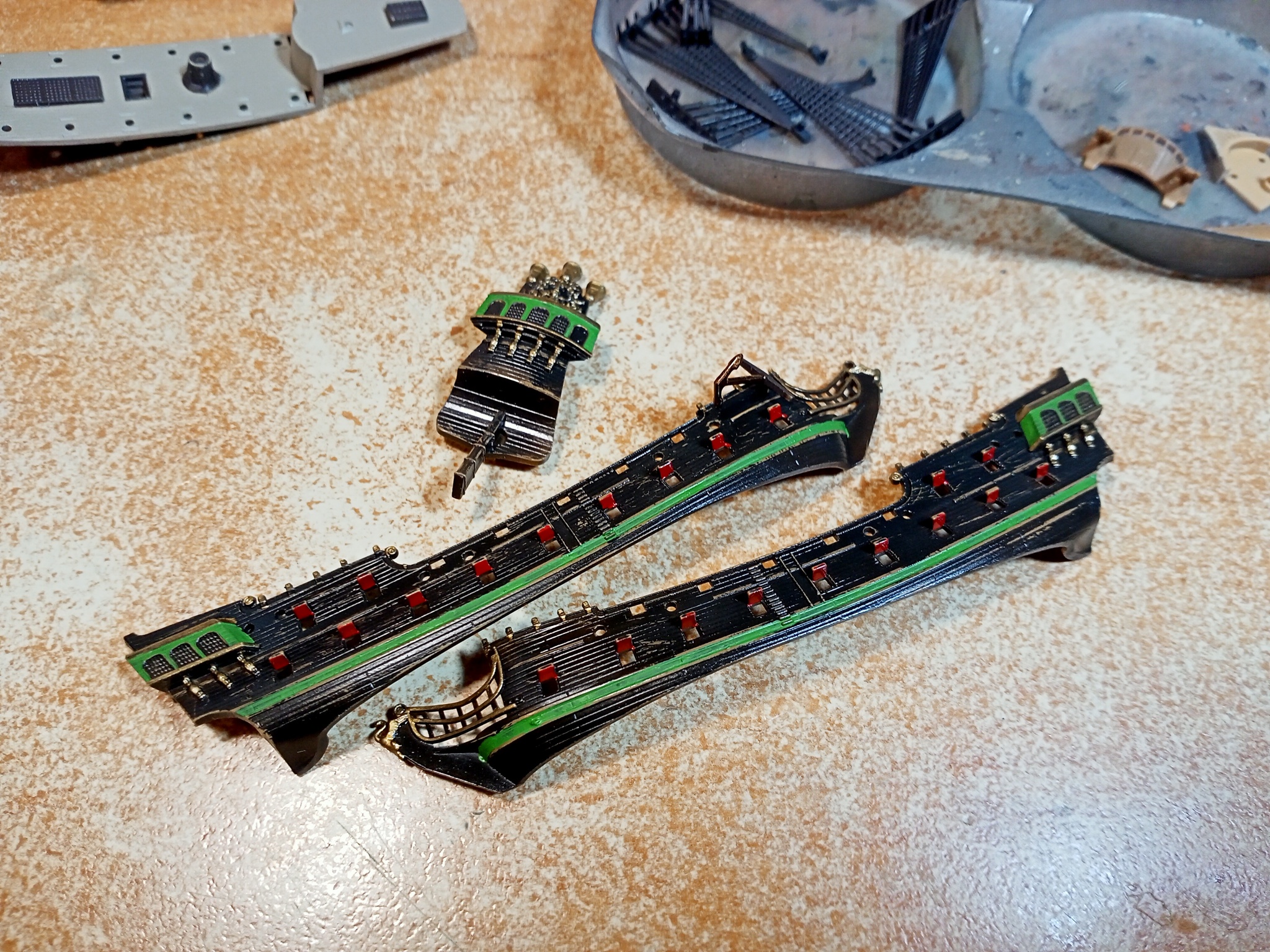 Собираем окрашенные детали корпуса, палуба, мачт и вант.