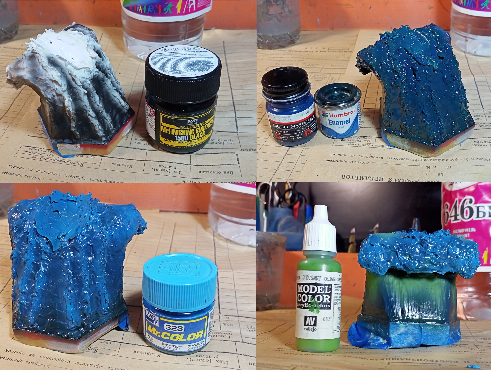 Подставка окрашена в цвет морской волны. Чёрный прешейдинг, сине-зелёная эмаль Humbrol, эмаль Testors Blue Angels Blue, затем высветление голубым цветом и оттенение прозрачной глубины ярко-оливковым.