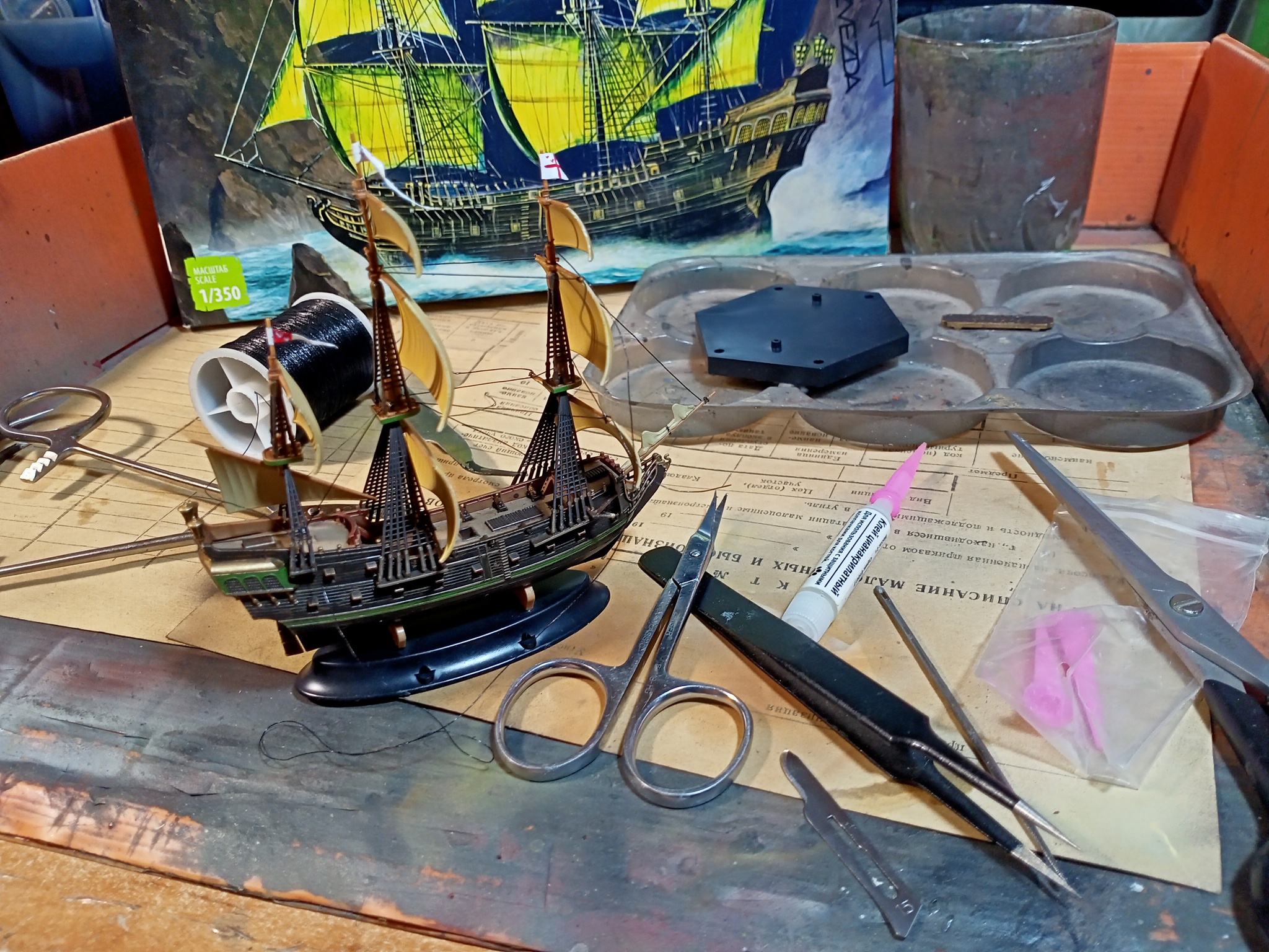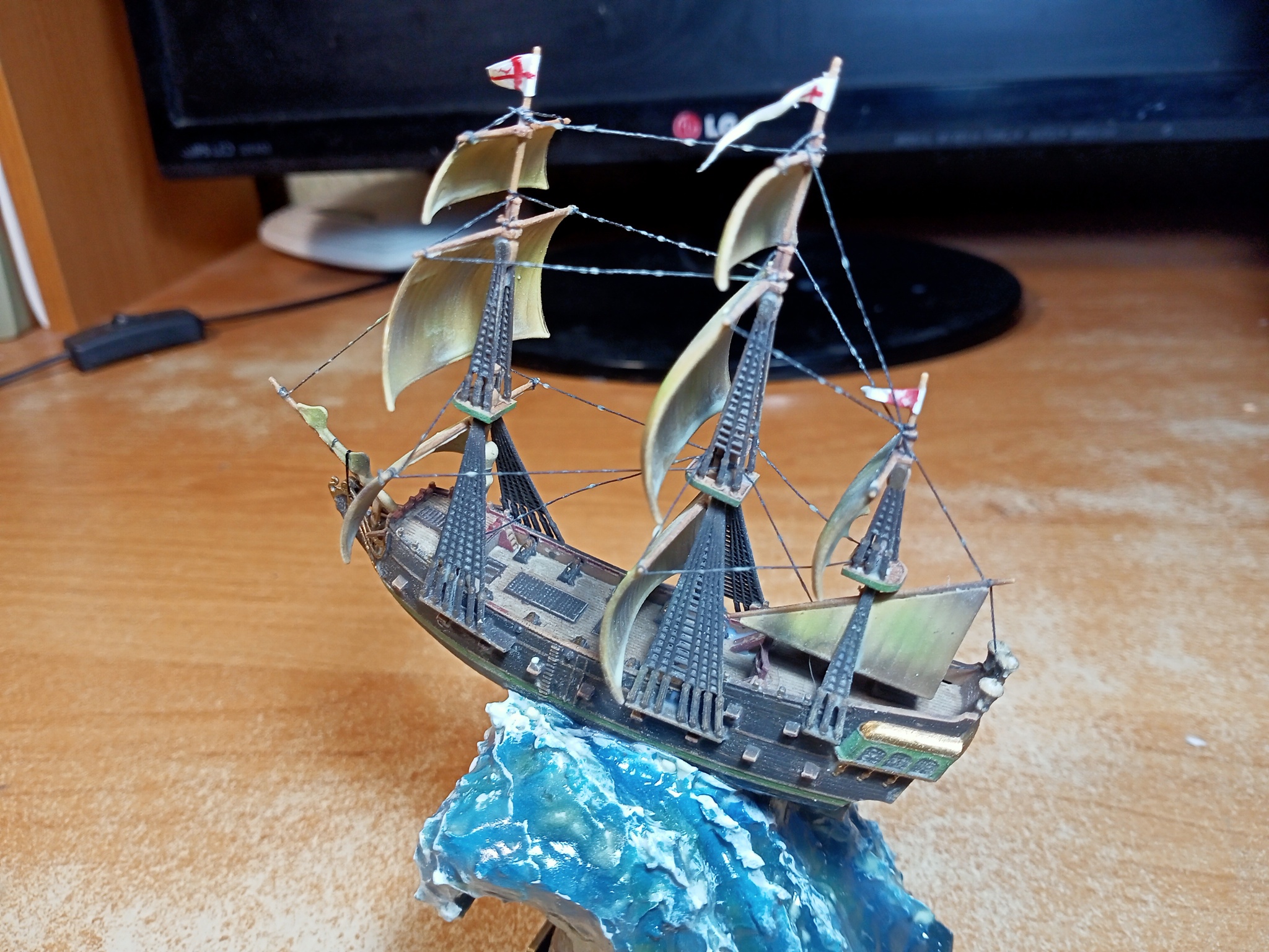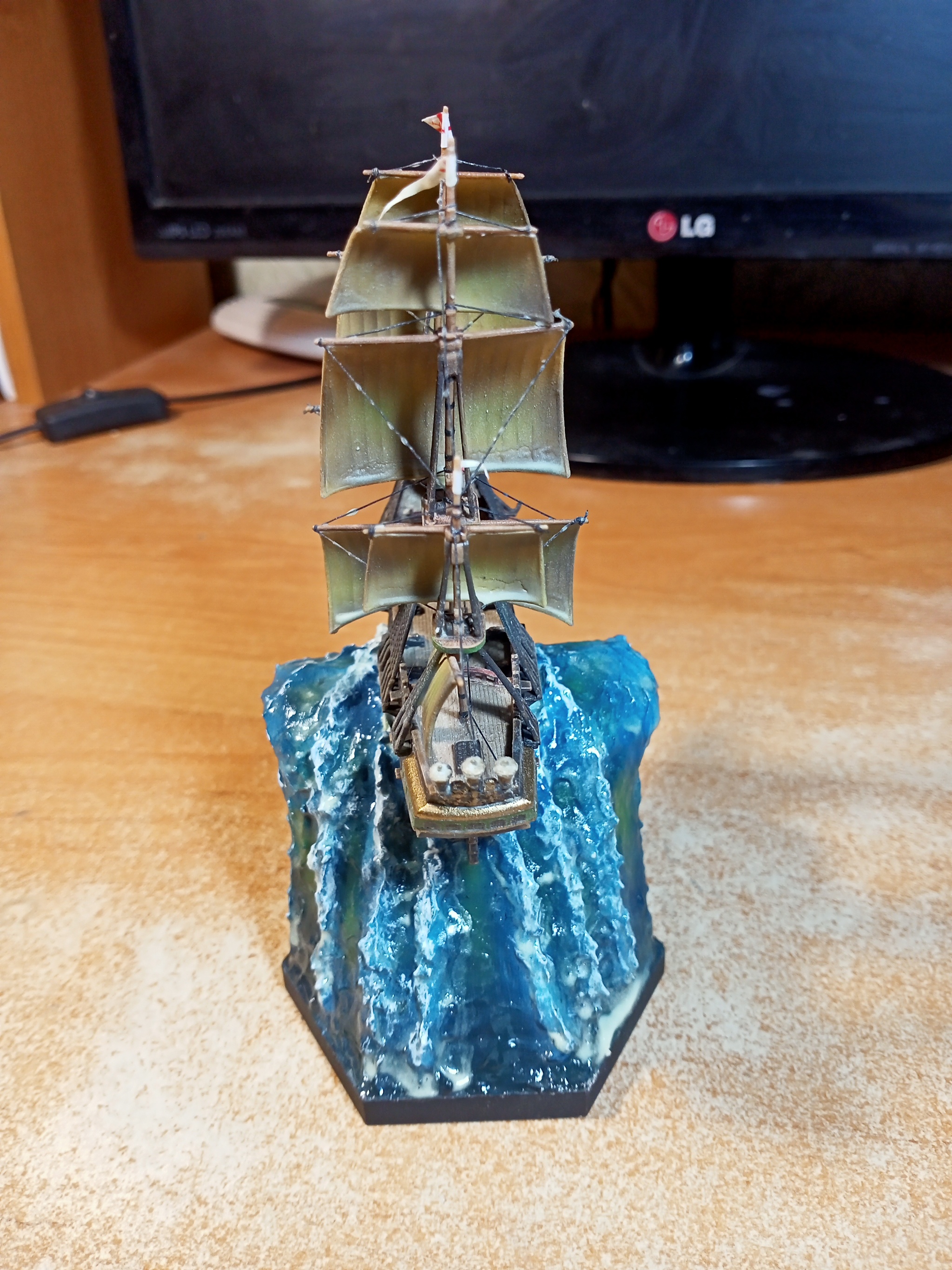 Приветствую, уважаемые подписчики, коллеги-моделисты и просто читатели! Примерно полгода назад я делал одну из самых необычных своих работ на заказ - "Летучий Голландец" от "Звезды" в масштабе 1/100. К тому же не просто так, а на диораме - выброшенный на берег. Работа была в целом благосклонно принята и вызвала обсуждения как тут, на Пикабу, так и в других соц.сетях, но также не прошла незамеченной и мимо друзей, знакомых и коллег в реальном мире. Потому я не был слишком удивлён, когда моя сотрудница пожелала иметь подобный светящийся парусник к Новому Году. Но я в то время был занят другими заказами, и был вынужден отказать, и мы условились о таком подарке на её День Рождения, что в апреле. Она не хотела настолько большой корабль, каким был "Голландец" в сотом масштабе, потому мы условились на масштаб 1/350. В остальном я был совершенно свободен. А поскольку я никогда не делал морской диорамы, да и предыдущий корабль-призрак, валяющийся на берегу, вызвал ряд замечаний, я решил дерзнуть и сделать его младшего братца, летящим на гребне волны. Посмотрим, что из этого вышло!