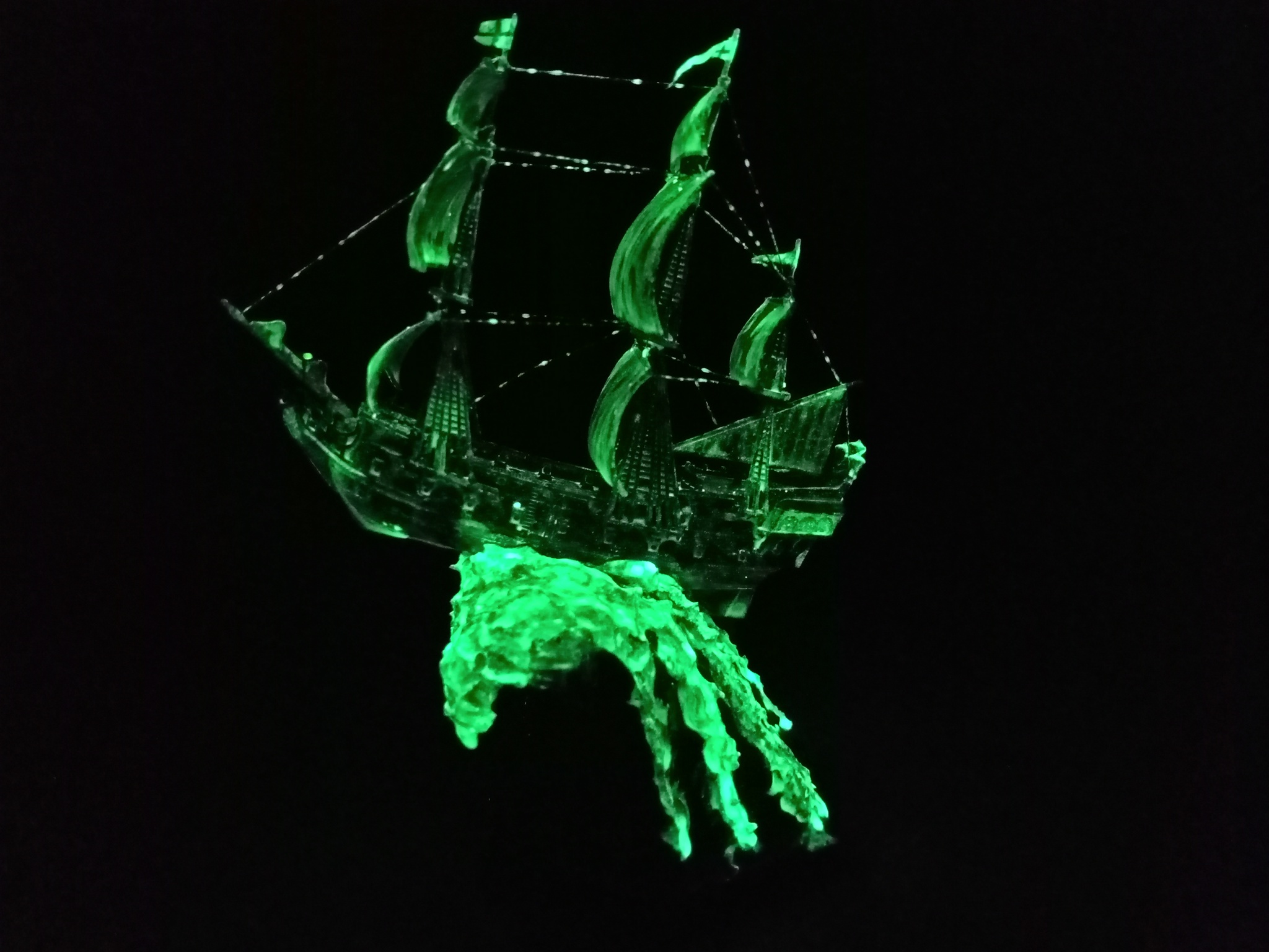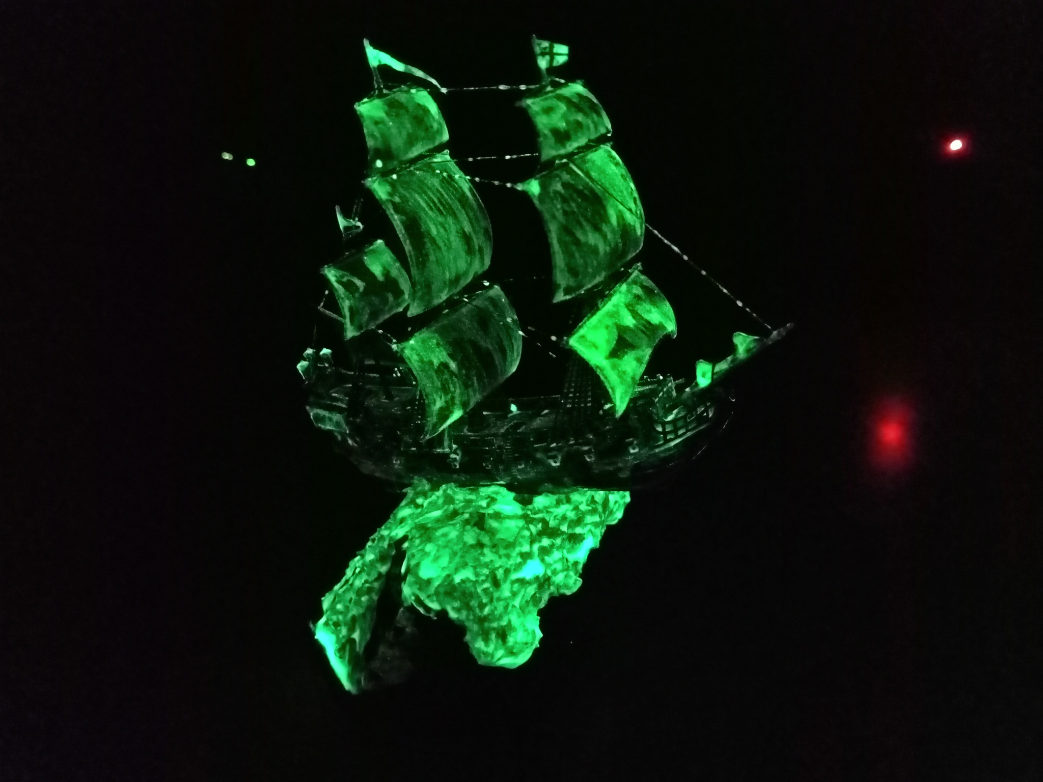 И завершение - работа с люминофором и лаками. После высыхания светящегося слоя кораблик задут ультраматовым лаком, а волна - снова покрыта глянцевым лаком кистью.