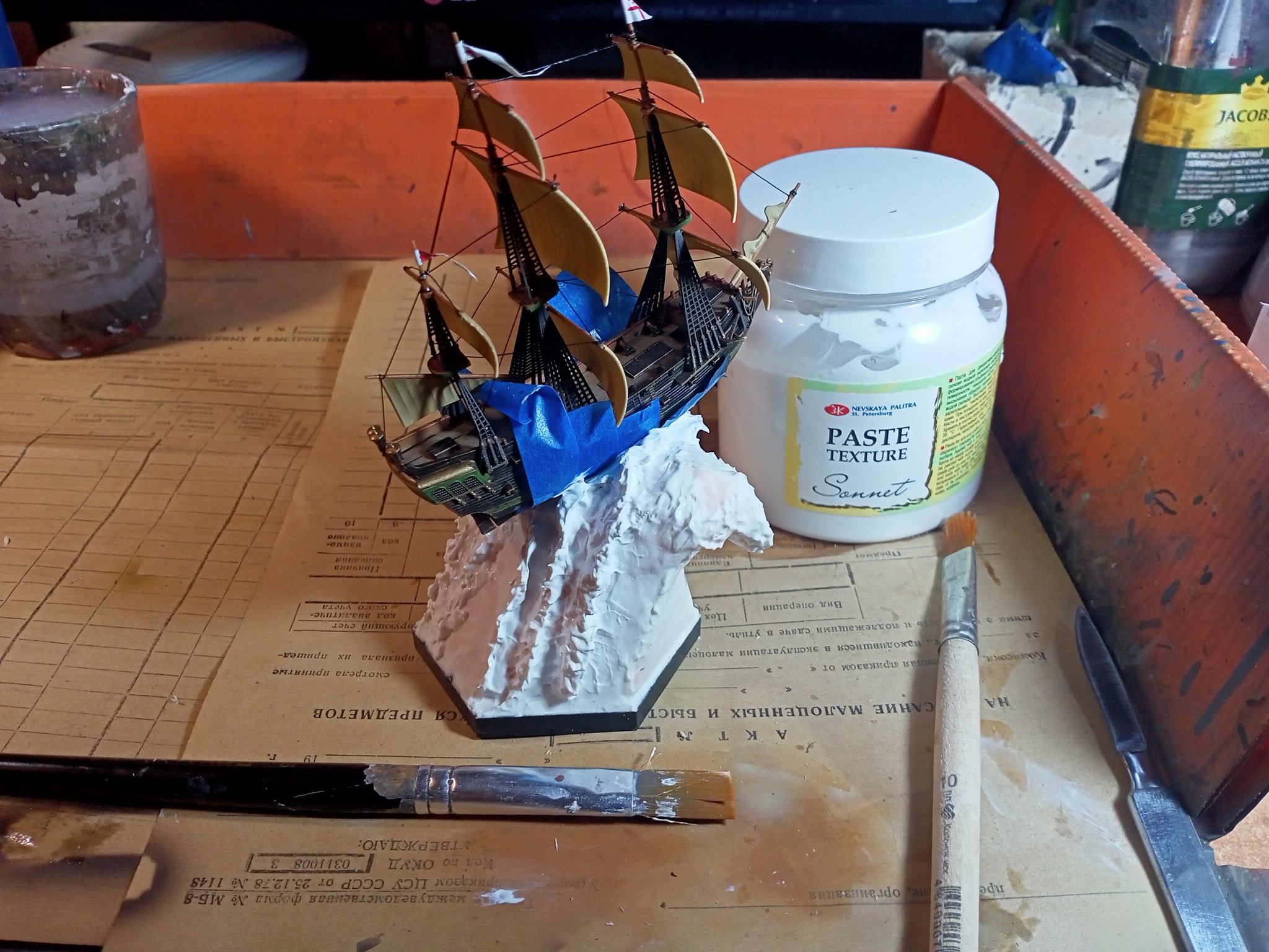 С помощью текстурной пасты "Сонет" из художественного магазина в два этапа (нанёс - сформировал - высохло - повторил) сделано подобие пены и бурунов.