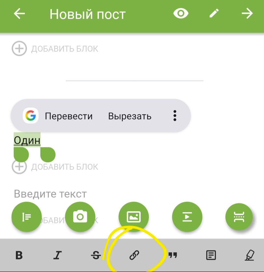 Добрый вечер. В приложении нужно выбрать текст и нажать на эту кнопку в нижней панели. После этого можно вставить ссылку