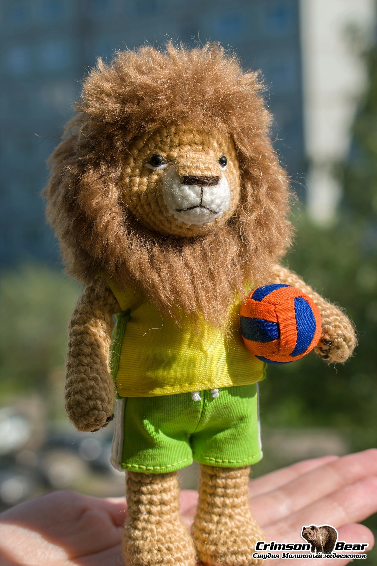 Лев волейболист в жёлто-зелёной форме с инициалами на спине и сине-оранжевым мячом. Мяч диаметром 22 мм. сшит из 18-ти элементов. Проволочный каркас в лапах и хвосте. Голова на шплинтовом креплении. Рост 14 см.