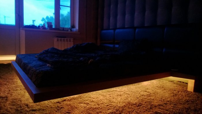 Размеры матраса 1,4 х 2 метра. По моим прикидкам общая стоимость материалов около 18 т.р. не считая цены матраса. Можно прилично сэкономить если использовать вместо мебельных щитов что-то другое. Так же можно сэкономить тысячу если отказаться от управления цветом подсветки, либо сэкономить 500р используя управление не по радио а по ИК. Крася основание не балончиками, как я (ленивая жопа), а кисточкой сэкономите ещё примерно тысячу.