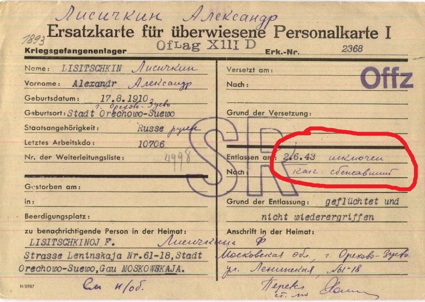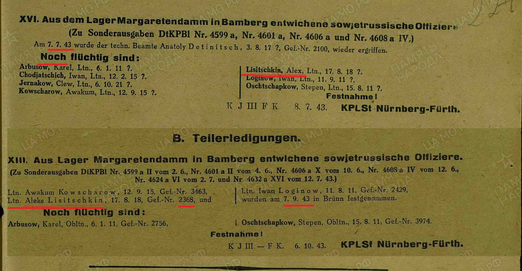 Как следует из сводок криминальной полиции Нюрнберга, по состоянию на 7-е июля был пойман один из беглецов (А.Детинич), тогда как Лисичкин и ещё 6 лейтенантов перечислены в разделе «ещё не пойманные». Но 7 сентября 1943 года, через 2 месяца после побега, его и ещё двоих поймали в Брюнне – это возле дорожной развязки в нескольких километрах восточнее Нюрнберга (того самого, где проходил послевоенный Трибунал), и в 55 километрах южнее исходной точки побега, т.е. от лагеря в Бамберге. Интерактивная карта этих мест доступна по ссылке: https://yandex.ua/maps/?um=constructor%3Aa501248bd9c64d38d45...