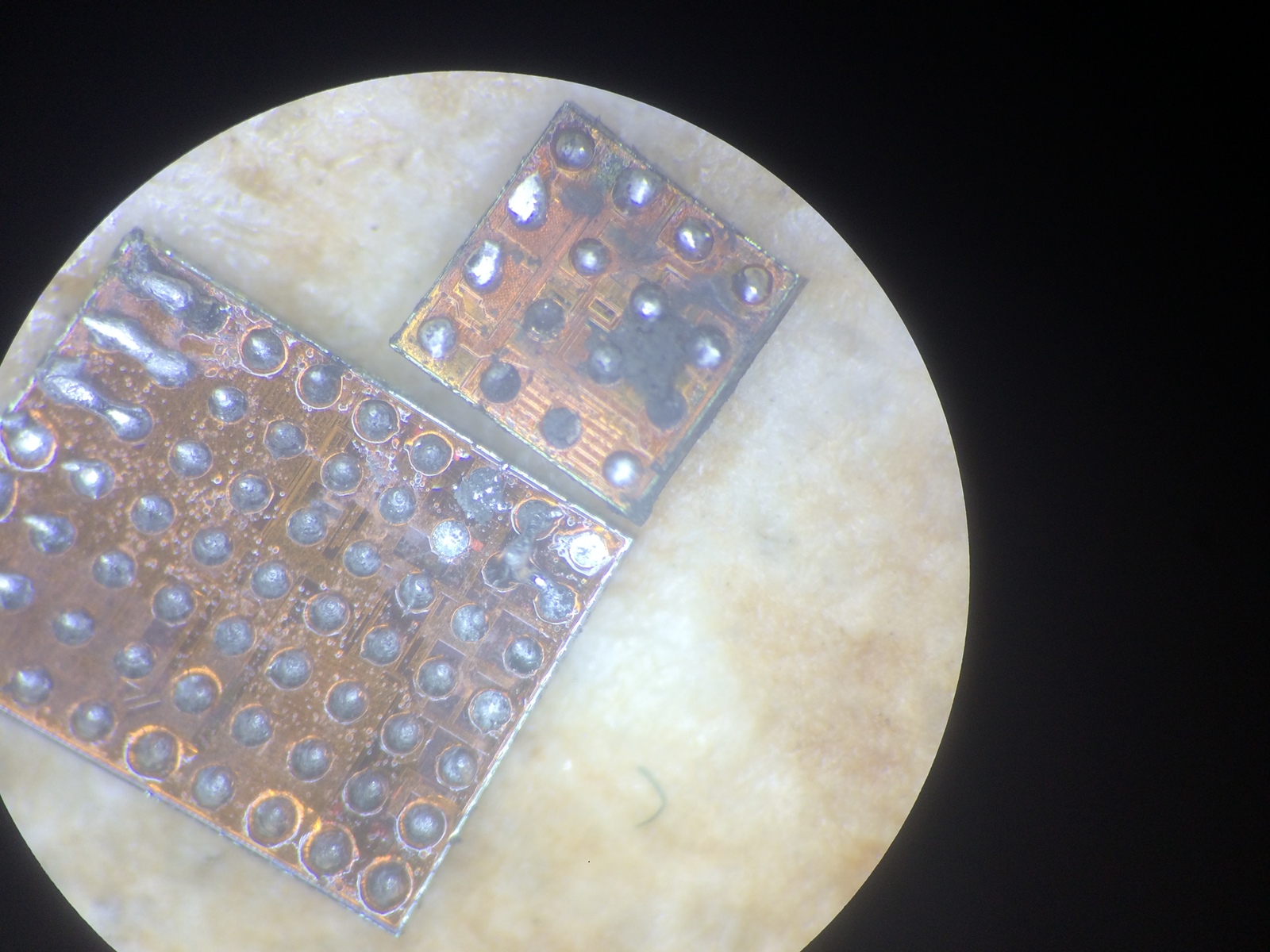 реболлим их. немного у одной поцарапался или от коррозии повредился лак, припой зразу прилип к образовавшейся металлической дорожке. И чтобы потом эта дорожка не слиплась с одним из шаров, на всякий случай помажем маской для плат