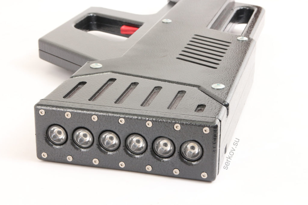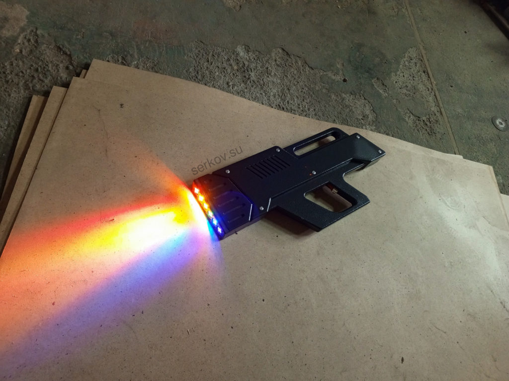 Внутри 6 каналов светодиодов разных цветов, 6 драйверов для выравнивания визуальной яркости, li-ion батарея и модуль со звуком — при включении бластера играет арфа.