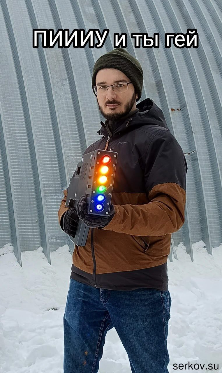 Этот арт-объект я задумал еще до принятия законов о запрете ЛГБТ пропаганды. Тогда чиновники, общественные деятели с таким остервенением искали радугу везде, приписывая ей разные тайные символы нетрадиционной ориентации. Видите на пакете молока на рисунке на фоне радуга. Видите цветов не хватает? Все, это точно ЛГБТ пропаганда! А если в одежде более трех цветов — все, ты видимо скрытый извращенец. И мне захотелось это дело обстебать, сделав бластер, стреляющий радугой.