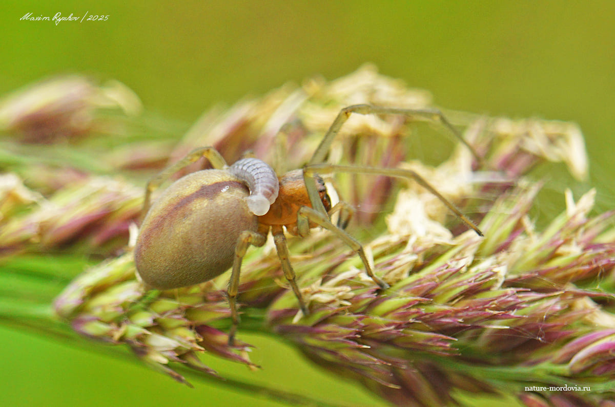 С очень большой долей вероятности, это червяк является личинкой осы Homonotus sanguinolentus (Pompilidae). Интересно, что первое и единственное упоминание об этом виде, для территории Мордовии (я сам отсюда), приводится в списке ос Мордовского заповедника (Мокроусов, Ручин, Егоров, 2013), причем в качестве нового вида для территории Среднего Поволжья! А эти осы, по литературным источникам (Day, 1988), являются единственным паразитом самок хейракантиума бродячего (Cheiracanthium erraticum).