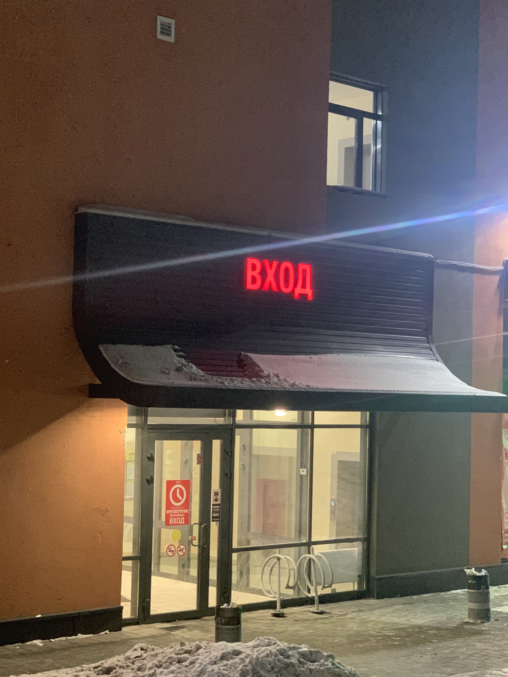 Вариант 1. Пятно строго над входом. На входе, скорее всего, стоит тепловая завеса (типа фена). Теплый воздух при открытии двери устремляется вверх. Вот он и прогрел. А потом часть снега сползла вниз, так как козырек имеет наклон.
