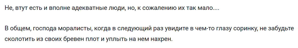 Ну и впервые вообще задумался о нике товарища. Проповедник... ну нихуя себе, нужно непременно с большой буквы говорить, наверное, и с придыханием. Это ж сам, солнцеликий... Проповедники же, по канону, они более народные — а у тебя чуть что, бан нахуй) Ты не проповедник, а поп карикатурный. Вот ещё пример его высказываний: