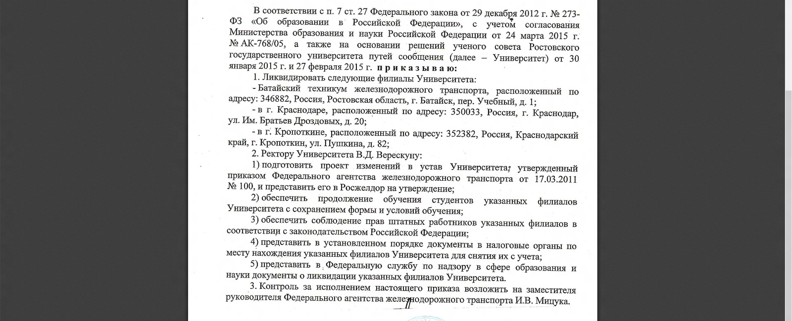 Уважаемые пользователи, и особенно юристы! Нужна ваша помощь, а именно: так уж получилось, что в славном городе Батайске в 2015 году был ликвидирован техникум. По сути, это единственное учебное заведение (было), которое обеспечивало подготовку профессионалов для железной дороги нашего округа. Из-за ряда событий (и некоторых мудаков) в настоящее время учебное заведение закрыто. Но суть не в этом, про процесс закрытия я вам расскажу позже, если будет интерес. Сейчас вопрос такой: согласно пункту 2.2. приложенного документа, ректор обязан обеспечить продолжение обучения студентов в соответствии с законодательством Российской Федерации.