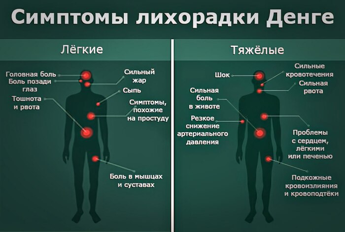 Симптомы заболевания включают высокую температуру, жажду, тошноту и сыпь на теле. Врачи рекомендуют пить жаропонижающие и регулярно сдавать кровь для контроля уровня тромбоцитов, чтобы предотвратить внутренние кровотечения.