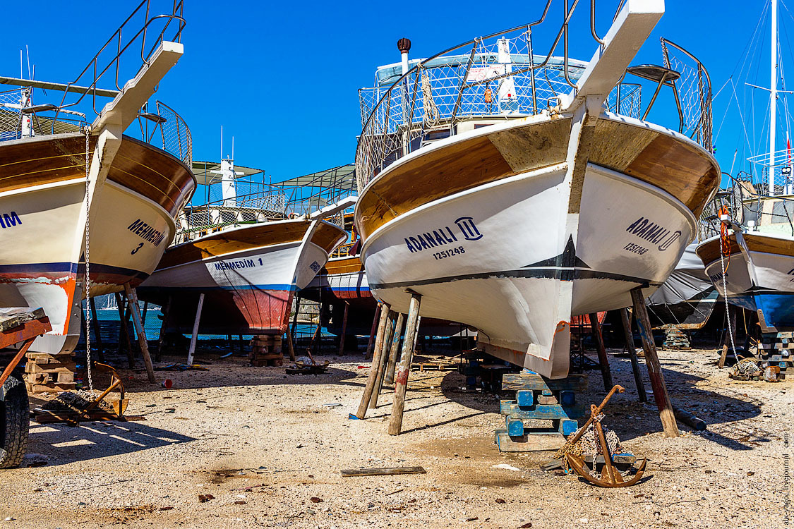На выходе из Учагыза располагаются гробницы древнего города Теймусса, чуть дальше есть хорошие места для палаток. Раньше, помню, возле дороги был кран с водой, но сегодня я его не обнаружил. И эта дорога привела меня в посёлок Алан, который состоит из пары десятков ферм на весьма обширной территории. Примечательно это место зимней яхтенной стоянкой: на берег вытащены десятки кораблей, которые тут чинят, чистят, красят и всячески готовят к грядущему туристическому сезону.