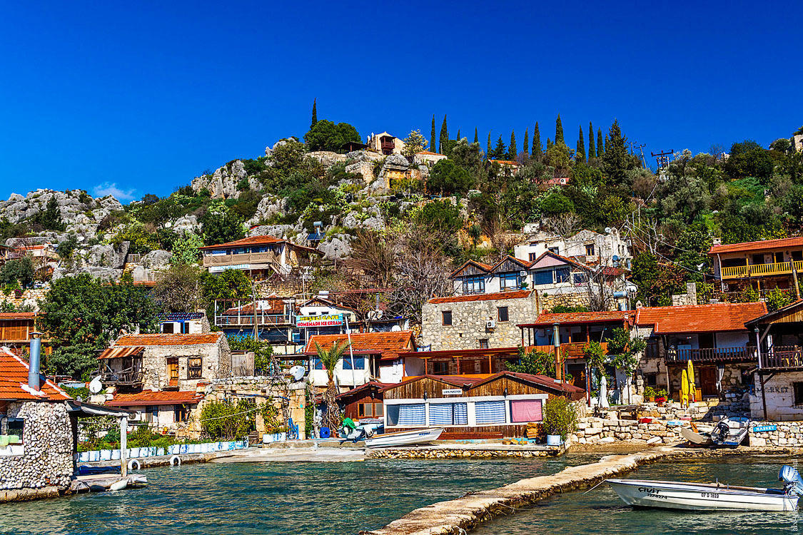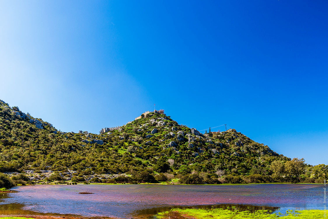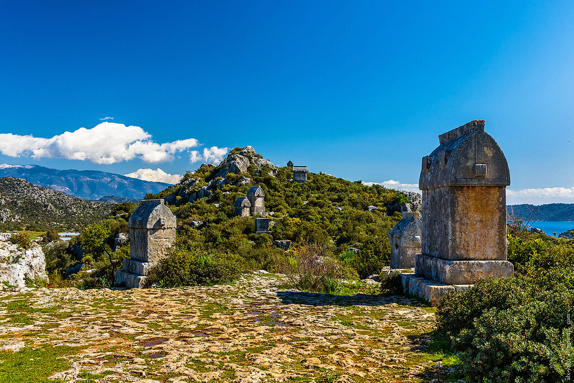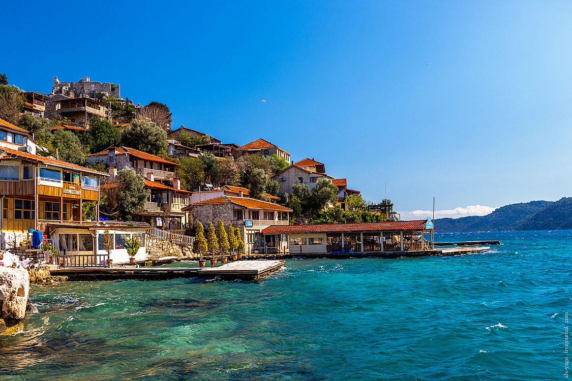 Это прям вообще очень классное место. На вершине холма крепость, рядом множество отлично сохранившихся ликийских саркофагов и старых оливковых деревьев. А на спускающемся к морю склоне — деревня Симена.