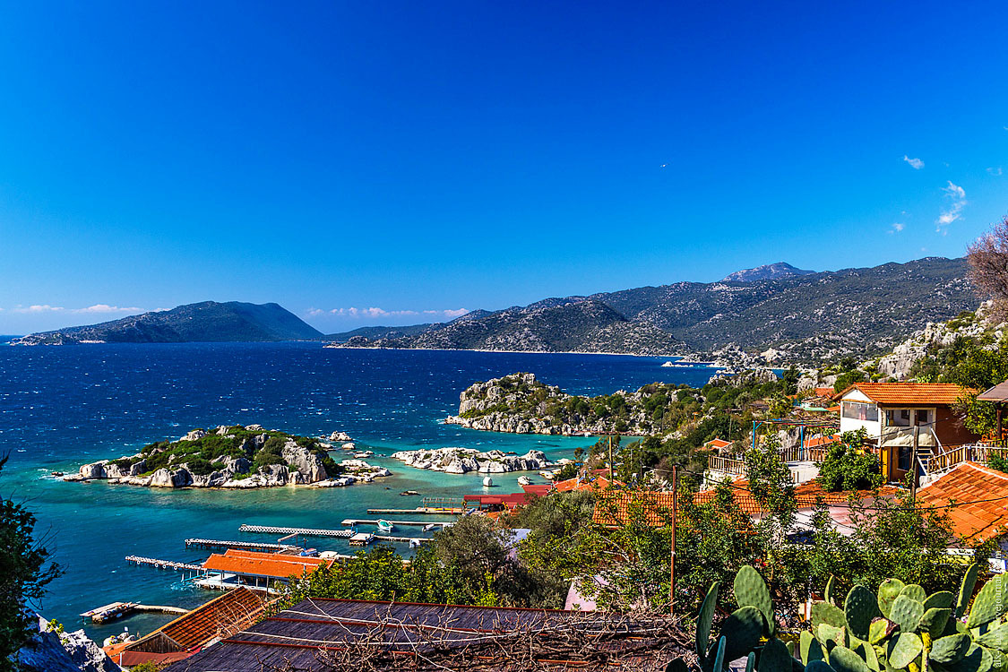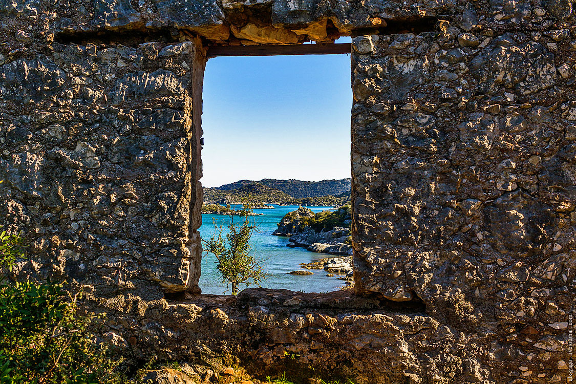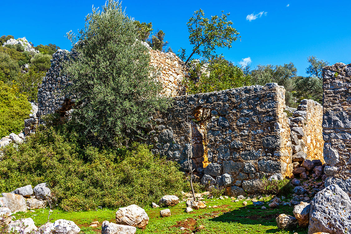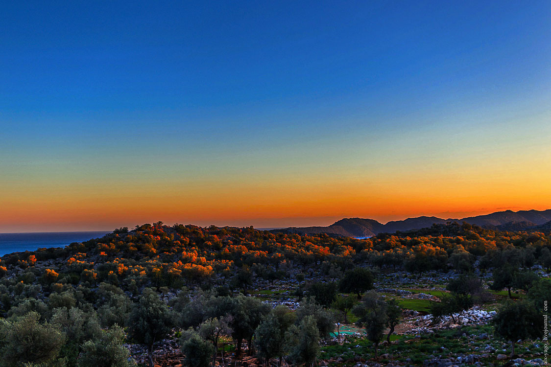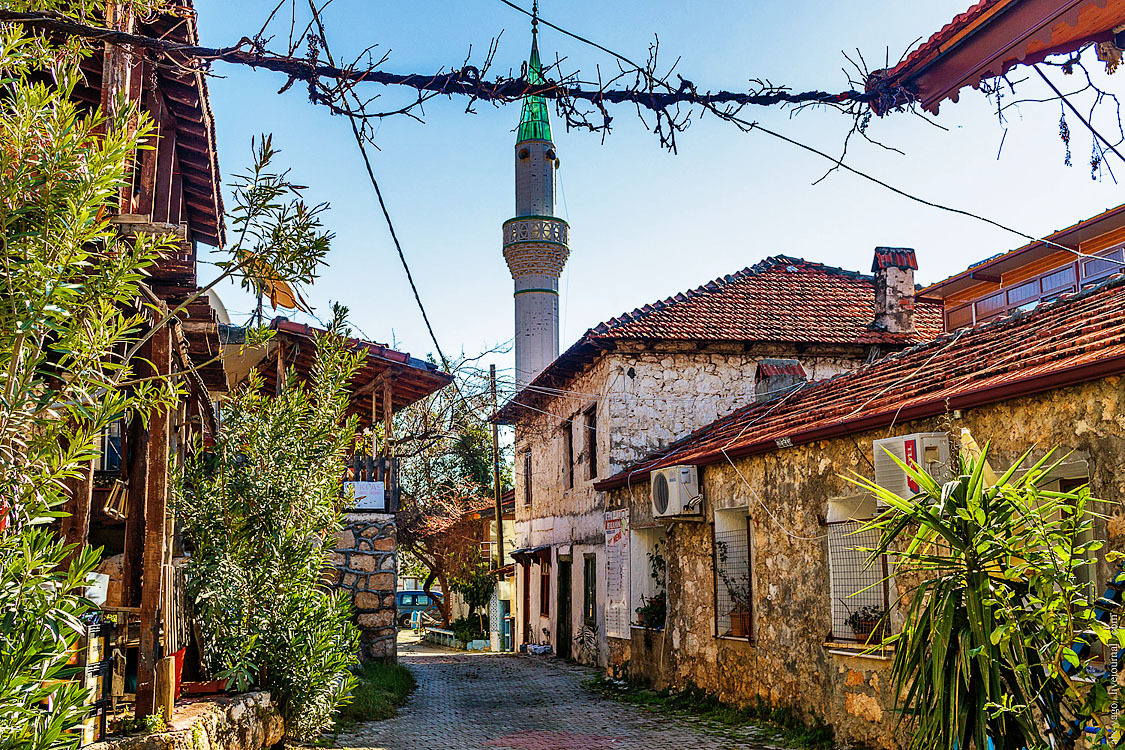 Это прям вообще очень классное место. На вершине холма крепость, рядом множество отлично сохранившихся ликийских саркофагов и старых оливковых деревьев. А на спускающемся к морю склоне — деревня Симена.