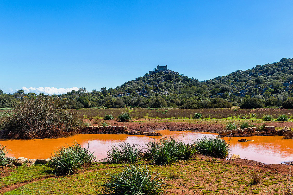 Нагулявшись, я вернулся к рюкзаку и двинулся дальше. После теплиц и ферм Алана тропа вышла на плоскую усеянную камнями равнину с огромным резервуаром для воды в центре. Здесь дорожки начинают ветвиться, сама Ликийская тропа уходит немного влево, но я хотел посетить бухту Бурч и руины сторожевой башни на холме возле неё. Самый удобный путь для этого — пойти направо, по дорожке, ведущей прямо к башне.