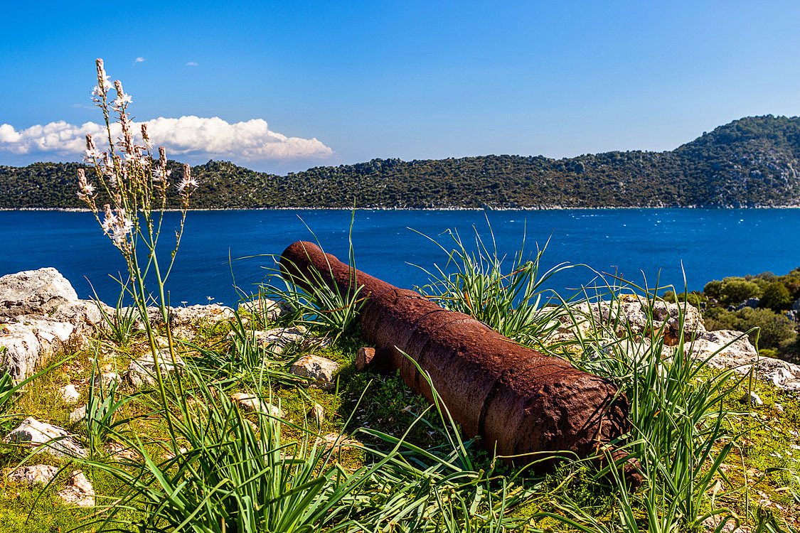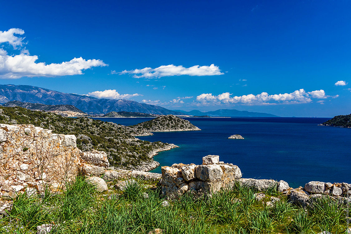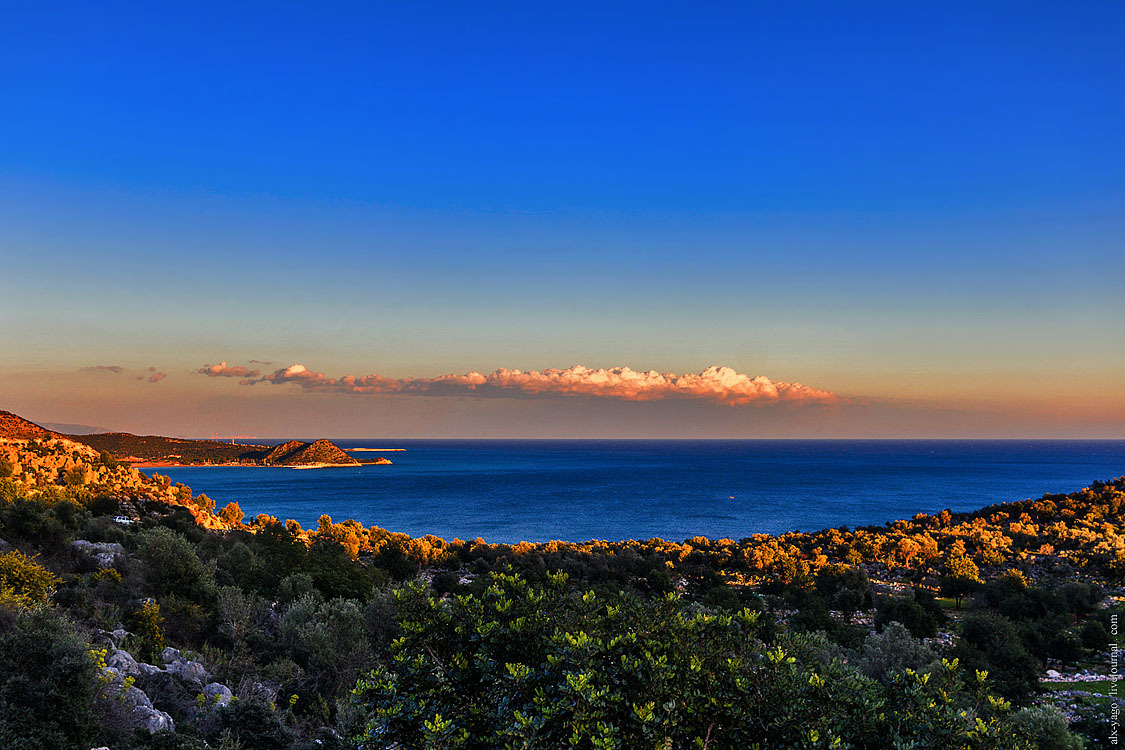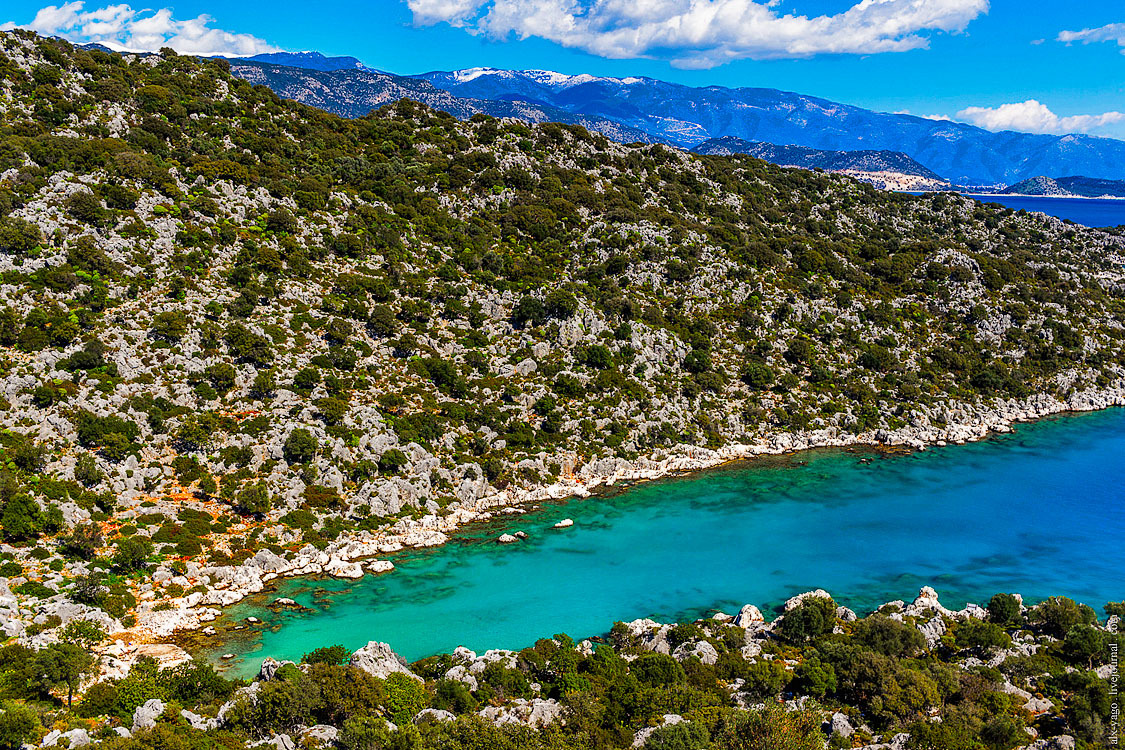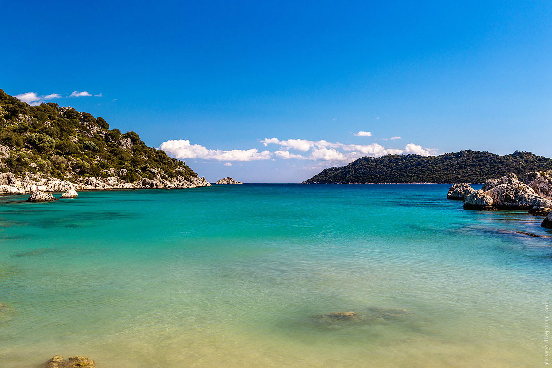 Учагыз — это компактный и весьма уютный посёлок, основной смысл которого состоит в том, чтобы организовывать яхтенные экскурсии к острову Кекова. Окрестности острова когда-то были большим античным городом, который в результате землетрясения погрузился на дно, и теперь туристы с интересом наблюдают, как он там под водой сохранился (если помните, про Аперлаи я говорил примерно то же самое, и обещаю сегодня ещё раз повторить эту историю). Я закупился продовольствием и по автомобильной дороге пошёл дальше.