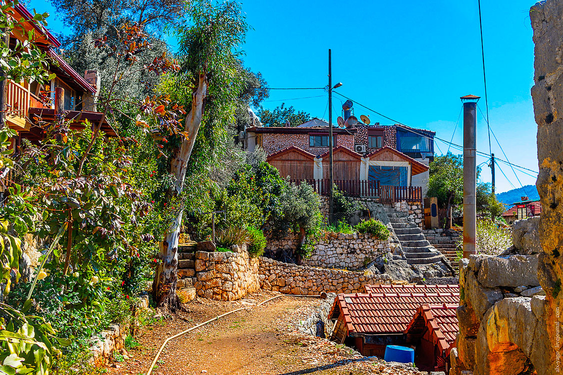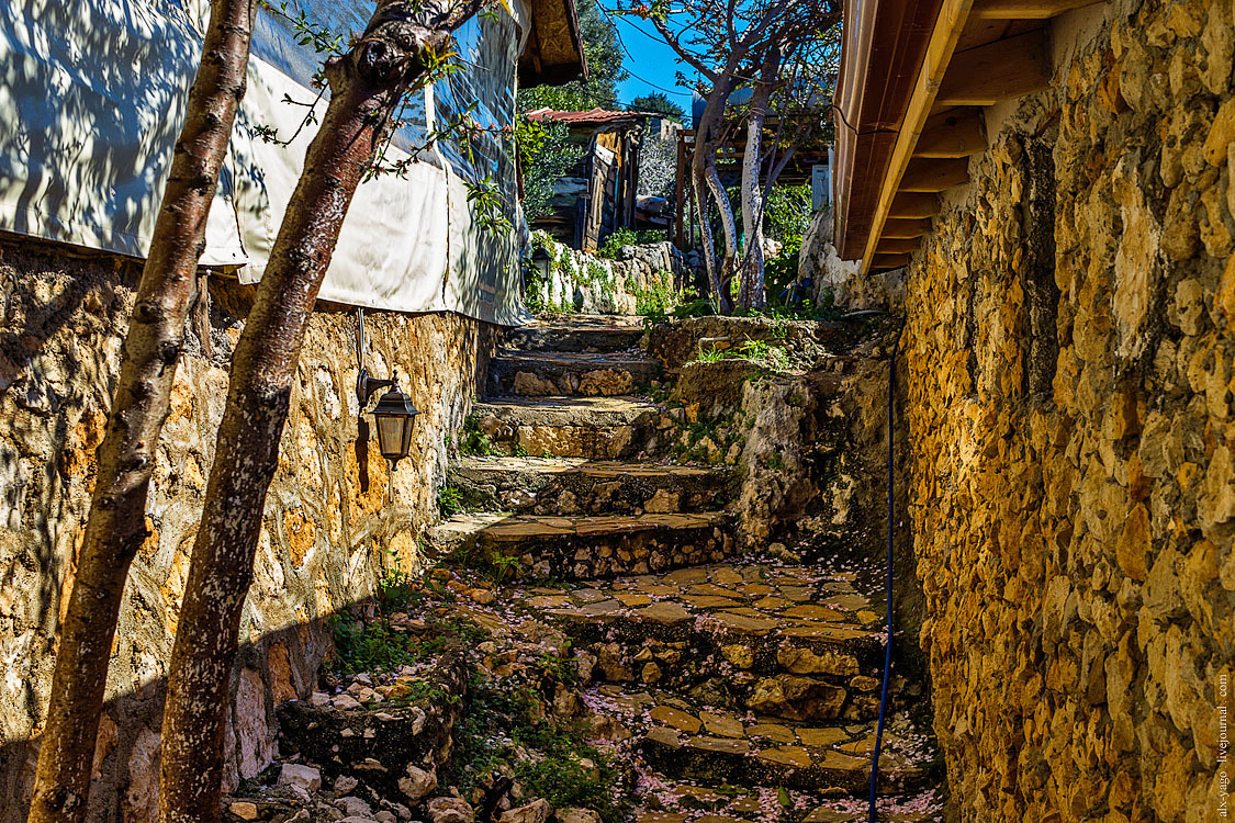 Когда-то здесь было большое античное поселение, но потом землетрясение… и дальше вы уже знаете. Осталась только эта деревенька, которая стала значимым историческим местом и охраняемым памятником культуры. И здесь офигеть как интересно. Из-за того, что деревня расположена на крутом склоне, в ней нет улиц, перемещаться приходится по лестницам, всяким запутанным переходам, дворам, верандам домов, и всё это складывается в какой-то безумный лабиринт. Обычно тут работает множество кафе, магазинов, сувенирных лавок и пансионов. На прогулочных кораблях привозят туристов, так что движуха знатная. Но сейчас было тихо и спокойно.