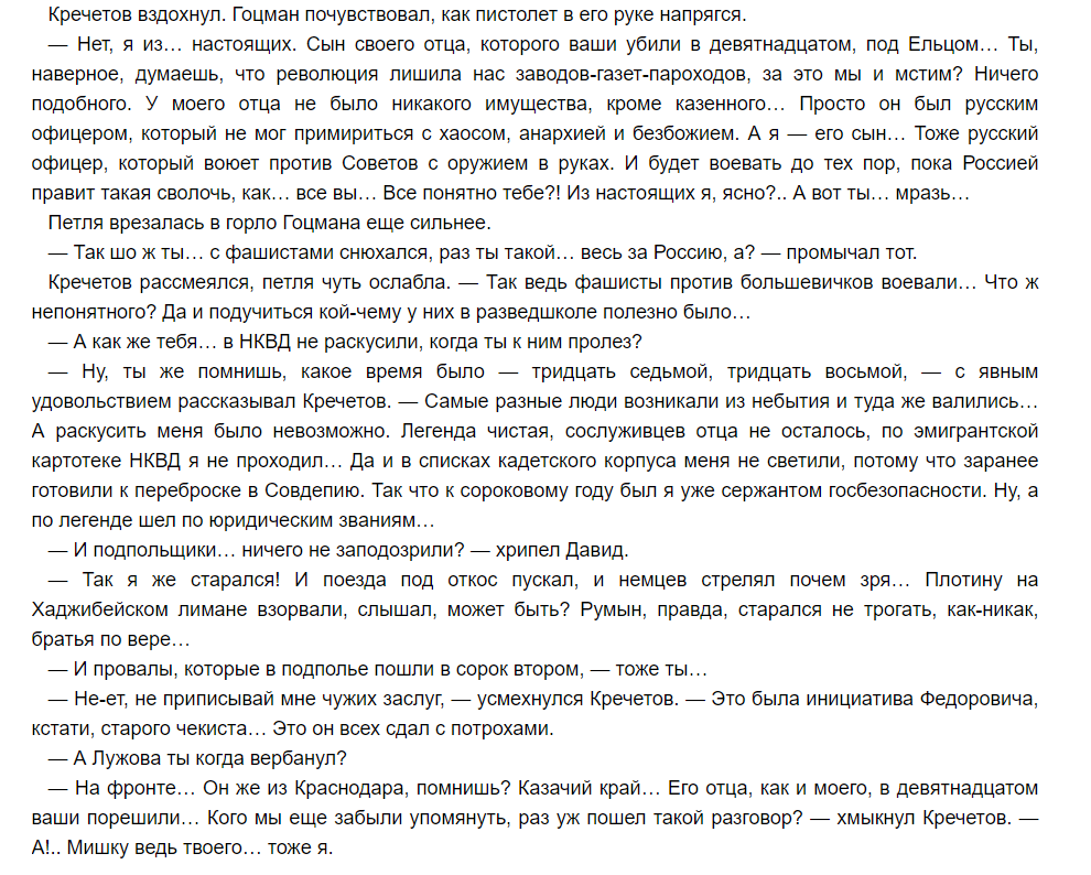 Гоцман спрашивает Кречетова чем же они Кречетову так не угодили то. На Кречетов запускает типичную шарманку любого современного антисоветчика, дескать большевики всем жизнь испортили, вы же все время воюете, когда не воюете друг друга убиваете и чужое делите. Короче типичный привычный уже для российского кино стандарт. Кстати, мотивация Кречетова в романе раскрывается более полно, оказывается Кречетов из бывших , сын белогвардейского офицера погибшего в Гражданскую войну и теперь он мстит большевикам