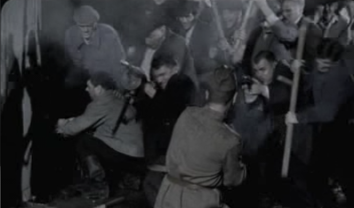 Тем временем, толпа вооружённая чем попало, подогреваемая людьми Чекана направляются на склады за оружием.