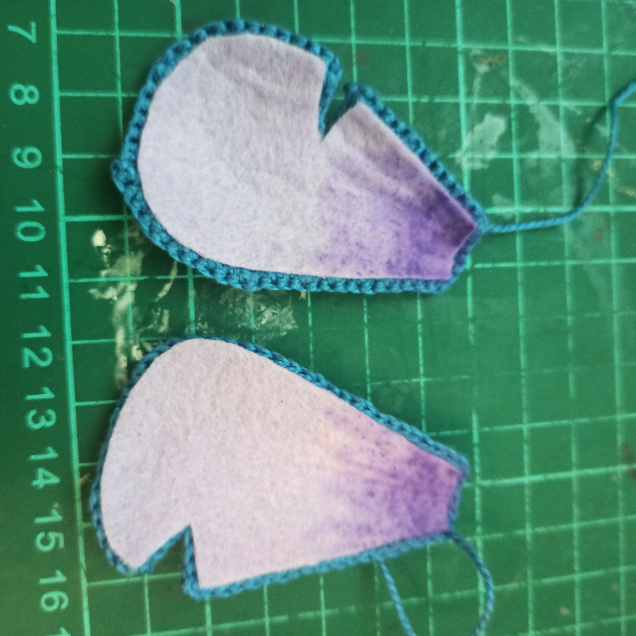 Далее демаем обвязку: 1 сбн в ту же петлю, что и последняя 23 ряда, 11 сбн до разреза уха зп основания рядов. Обрезаем нить закрепляем на внутренней стороне уха, ибо она будет закрыта фетром (она определяется так: разрез на задней стороне уха должен оказаться).