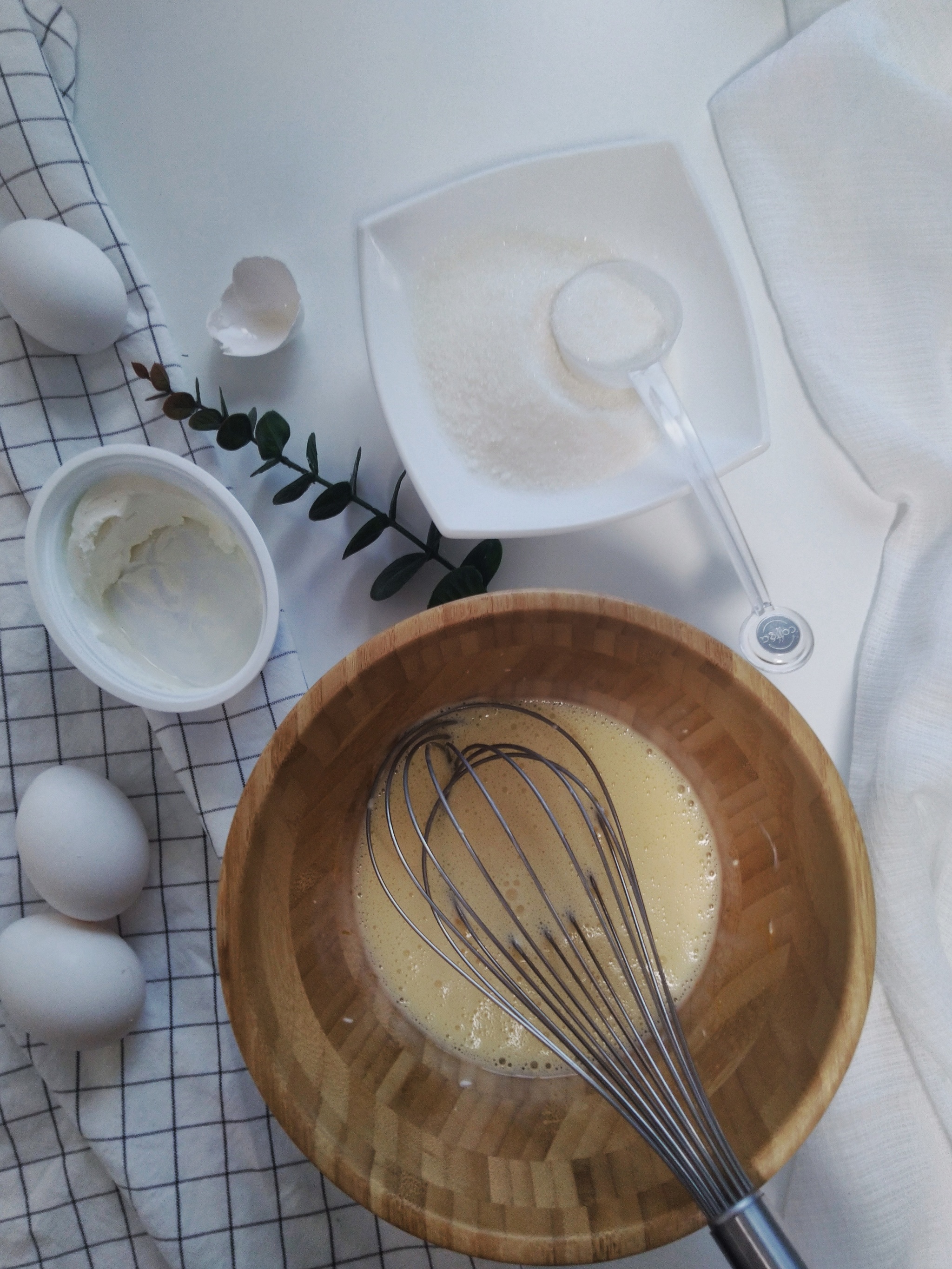 Вот такое тесто должно получиться. На этом этапе можно всё бросить, налить тесто в форму и отправить в духовку, кексы сами по себе будут очень вкусными и ароматными, но с чизкейком будут немного интереснее, поэтому берём ингредиенты для чизкейка и смешиваем венчиком. Получится жижа, но вы не пугайтесь, в духовке она застынет