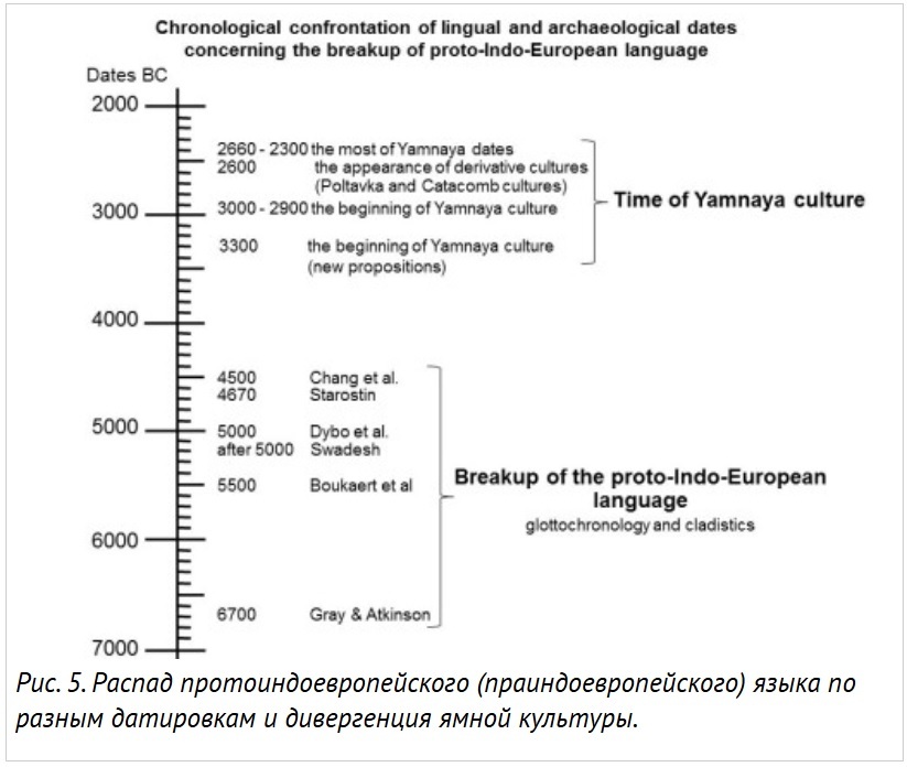 Пример предположений разных команд о времени разделения праиндоевропейского языка. Ну и время существования древнеямной культурно-исторической общности.