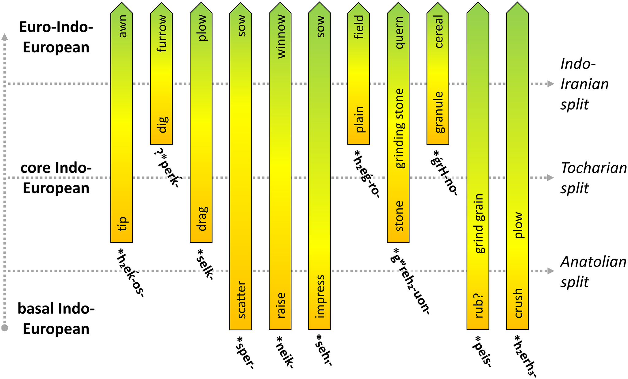 Для земледельческой терминологии до отделения анатолийского языка найден корень *(H)ieu(H)- и, возможно, корень *ǵh(e)rsd- , где оба означают "зерно, злаки". Перед разделением основных ветвей уже появились следующие корни *h2erh3- "плуг" (был известен даже до отделения тохарских), *h2erh3-ur/n- "(пахотное) поле", *peis- "молоть (зерно)", *se-sh1-io- "зерно", *h2ed-o(s)- "(сухое) зерно". Отсюда делаются следующие выводы - земледелие должно было войти в жизнь праиндоевропейцев до отделения тохарских языков. В более ранней стадии оно менее вероятно - там с зерновыми могли быть знакомы в результате импорта. На уровне перед разделением основных языков общество должно было использовать земледелие как минимум в качестве "престижной технологии".
