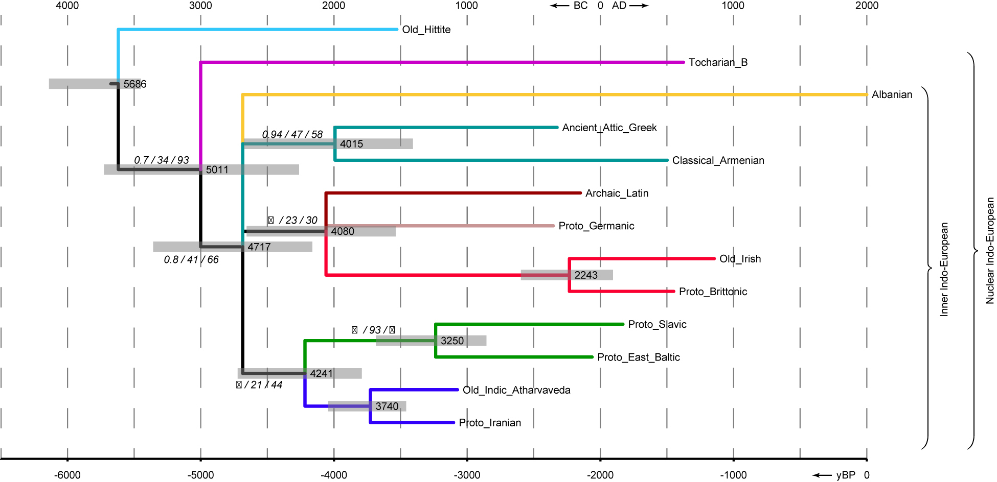 Дерево ИЕ языков. Серые линейки показывают временной интервал с 95% вероятностью времени расхождения, справа от каждого узла указывается среднее время расхождения. Из работы Касьяна А. и сотоварищей.