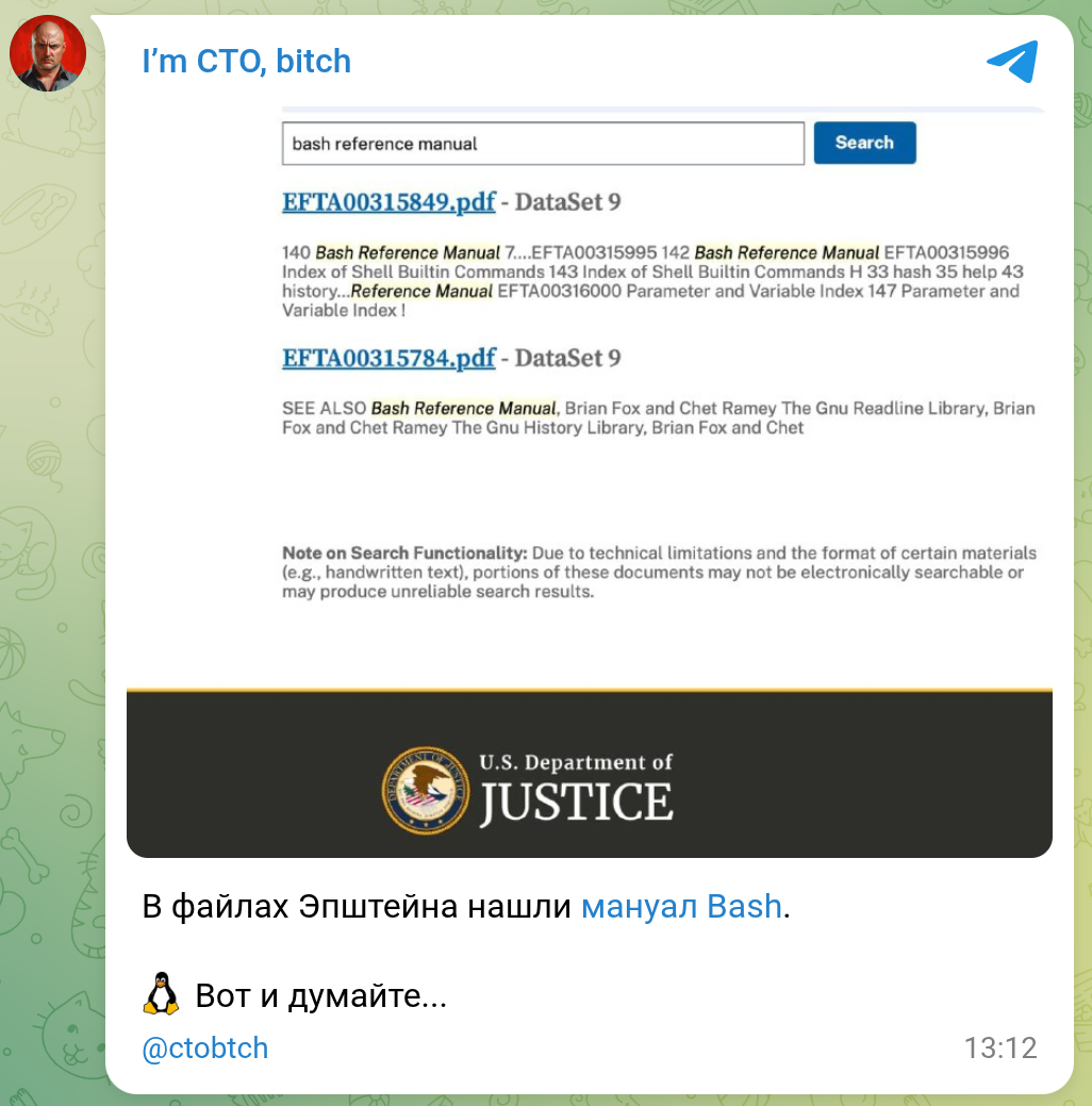 144 imctobitch IT-юмор Линукс для извращенцев Серия I'm CTO, bitch 5 дней назад Пруф: https://www.justice.gov/epstein/files/DataSet%209/EFTA00315849.pdf Pikabu зачем-то требует, чтобы я тут ещё написал минимум 40% текста, иначе ссылку не даёт выложить 🤡 I`m CTO bitch Командная оболочка bash Linux Файлы Эпштейна Джеффри Эпштейн IT юмор 43 7 1 Ещё 0