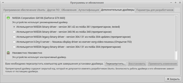 И уже в открывшемся окне выбираем нужный нам драйвер. Хоть я и использую драйверы ветки tested, вам этого делать не советую. Используйте стабильные драйвера, в моем случае nvidia-340 и будет вам дзен, спокойствие и стабильность.