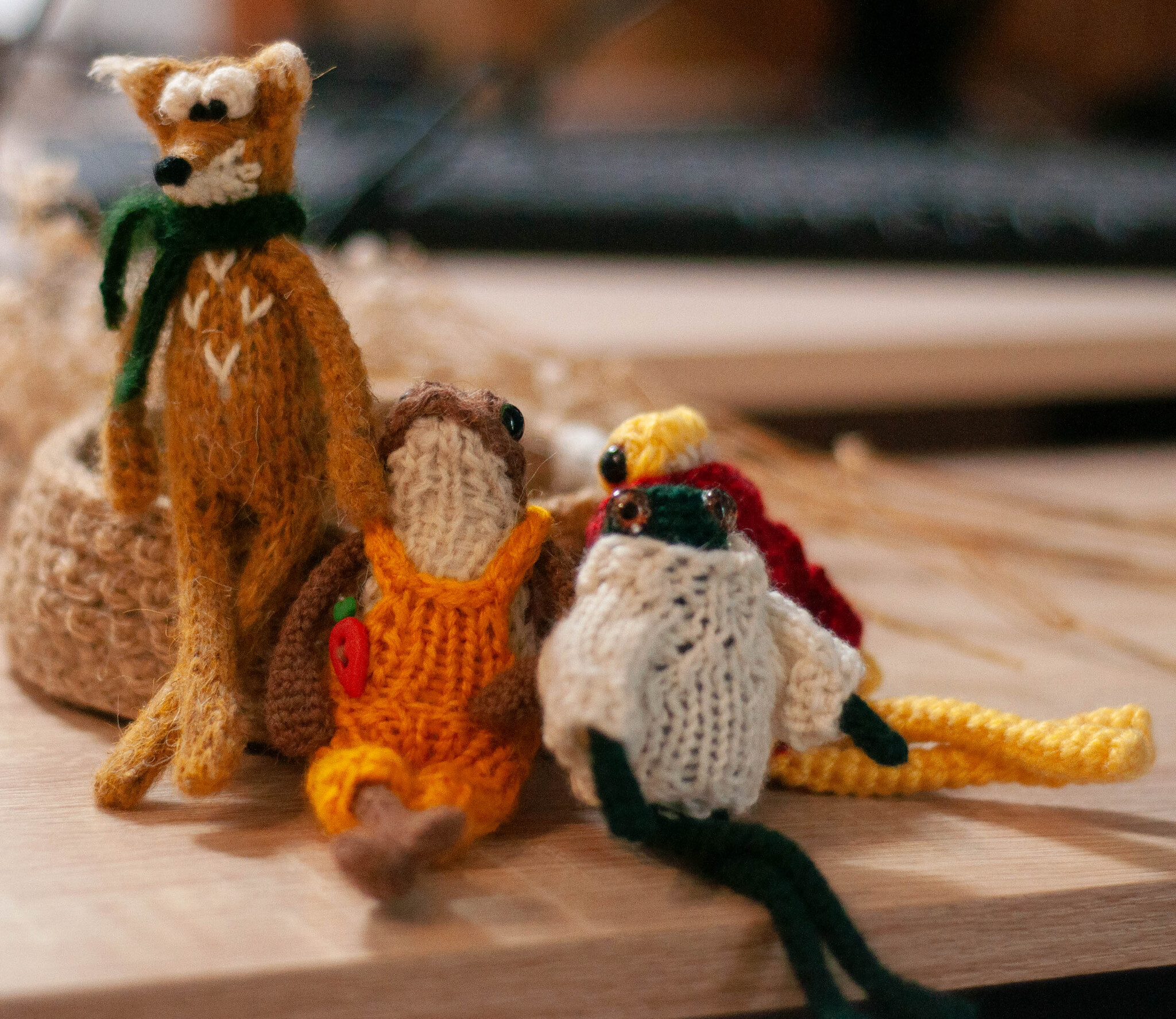 Такая компания каркасных игрушек проживает у меня дома. Весёлые и самое главное гибкие шерстяные игрушки. Могут сами сидеть и украшать полку или краешек стола.
