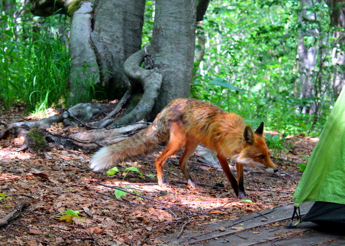 Вернулись в лагерь, поели, легли спать. В 4 утра мой попутчик закричал. Оказалось приходила лиса. Прогрызла палатку и пыталась утащить пакет с салом. Парень отбился как мог. Сало было спасено, а вот в палатке была большая дыра.