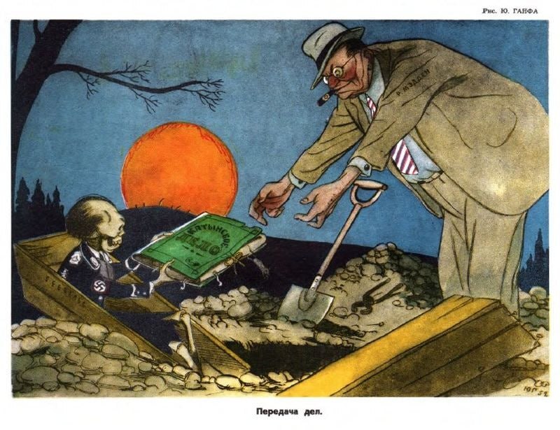 «Передача дел». Карикатура Юлия Ганфа. 1952 г.