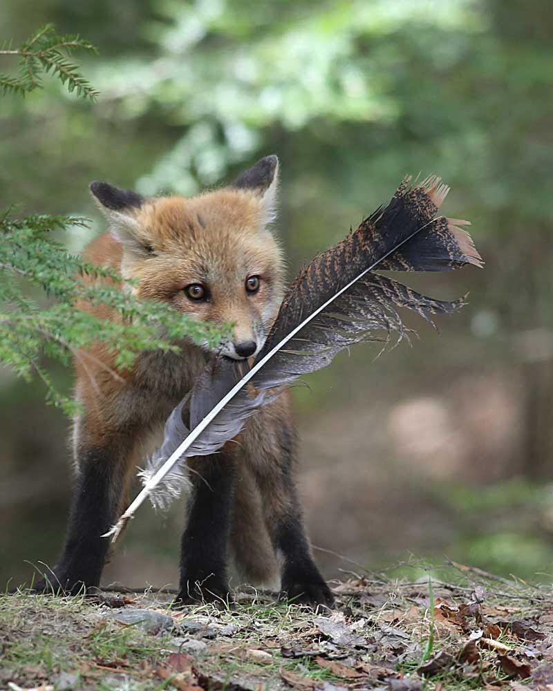Этот двухмесячный лисёнок несколько минут развлекался с хвостовым пером дикой индейки – подбрасывал его в воздух, набрасывался на него, жевал и просто бегал с пером в пасти.