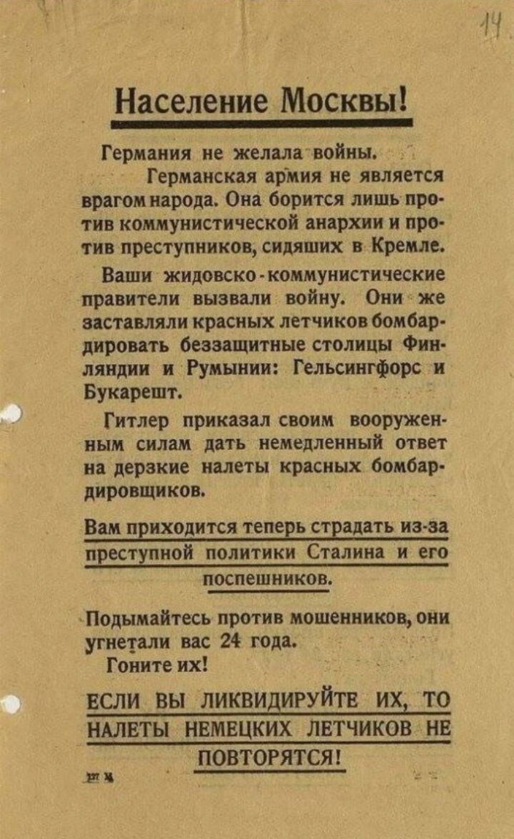 Здравствуйте Уважаемые читатели! Лицемерная листовка Геббельса для жителей Москвы, и это в то время, когда по пятам немецкой армии шли специально сформированные айнзатцгруппы, устраивающие расправы над мирным населением. Да и большие города кормить никто не собирался, в первую зиму планировали заморить голодом 30 миллионов. Кстати в октябре 1941 года продвижение немцев помогли оставить ВВС, которые срочно перебросили на подступы к столицы, но это редко вспоминают. А на этом все. Еще больше фактов на моем канале "Наша история это Гордость" в ТГ. До свидания!