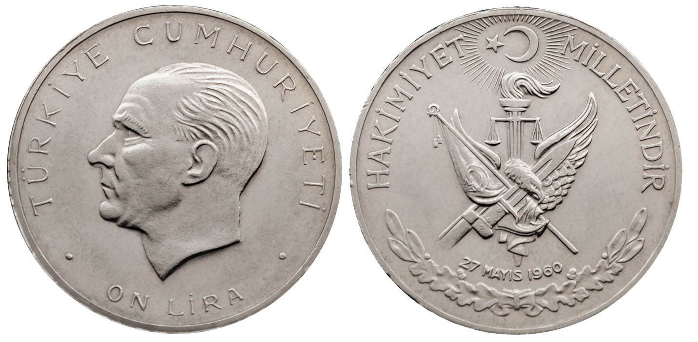 Вначале о монетке, не столь давно появившейся у меня. Её тема - государственный переворот в 1960 году. Что-то среднее между путчем и революцией но без стрельбы и кровопролития. В истории многих государств подобных событий хватает. На реверсе символика пришедших к власти.