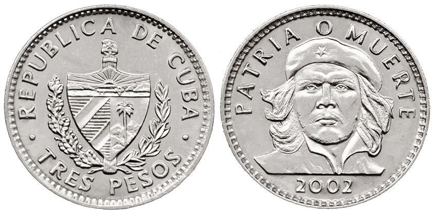 Эта же фотография появляется на монете Республики Куба, номиналом 3 кубинских песо. Регулярный чекан. Но монеты в 3 песо выпускались не часто. 1990, 1992, 1995, 2002. Сталь с никелевым покрытием, тираж 10 000 000. Empresa Cubana de Acuñaciones, Гавана, Куба.