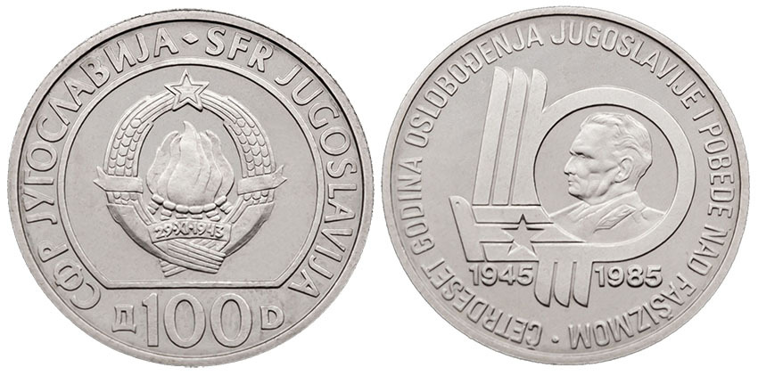 Реверс - Надпись 40-летие освобождения Югославии и победы над фашизмом, стилизованная цифра 40 и в середине - портрет Иосипа Броз Тито. Даты 1945 - 1985.