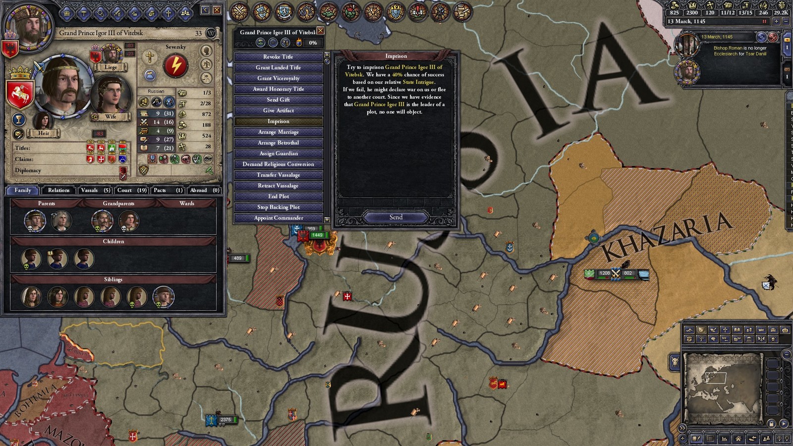 Определившись со стратегией, я вызвал тайного советника, то есть полез в меню интриг, дабы изыскать повод отдать приказ об аресте какого-нибудь «излишне равного» великого князя.