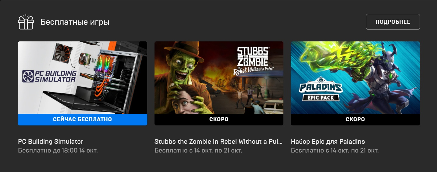 В цифровом магазине Epic Games Store забрать бесплатно и навсегда в свою библиотеку до 14 октября можно PC Building Simulator. После этого стартует раздача Stubbs the Zombie in Rebel Without a Pulse и набора с персонажами и предметами для мультиплеерного экшена Paladins.