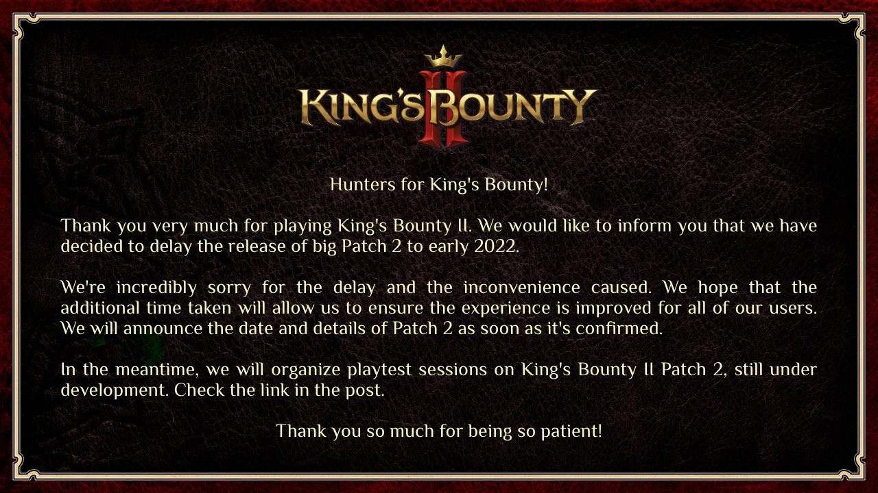 Компания 1C Entertainment и разработчики ролевой игры King's Bounty II с тактическими пошаговыми боями сообщили, что вынуждены перенести выход второго крупного патча на начало 2022 года. Однако уже сейчас любой желающий может записаться на бета-тест обновления.