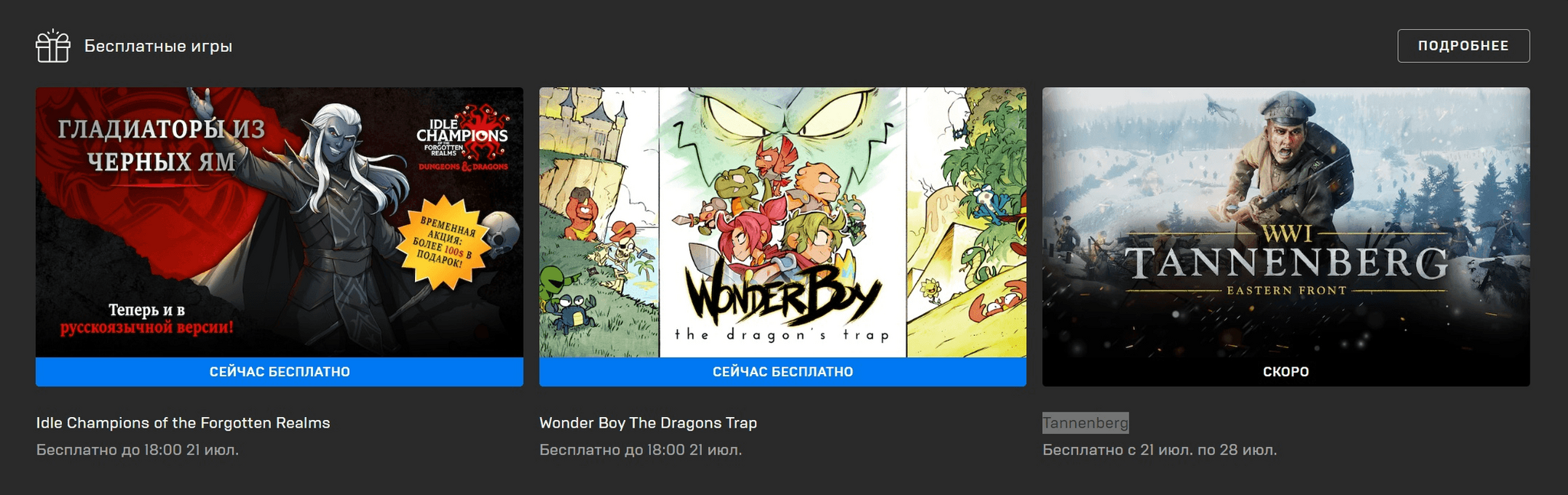 В цифровом магазине Epic Games Store забрать бесплатно и навсегда в свою библиотеку до 21 июля можно приключенческий платформер Wonder Boy: The Dragon's Trap и стратегическую Idle Champions of the Forgotten Realms. После окончания этой раздачи начнут выдавать военный экшен Tannenberg.