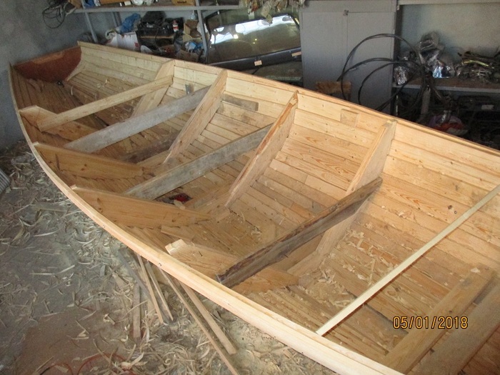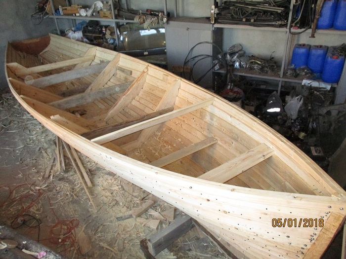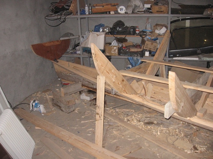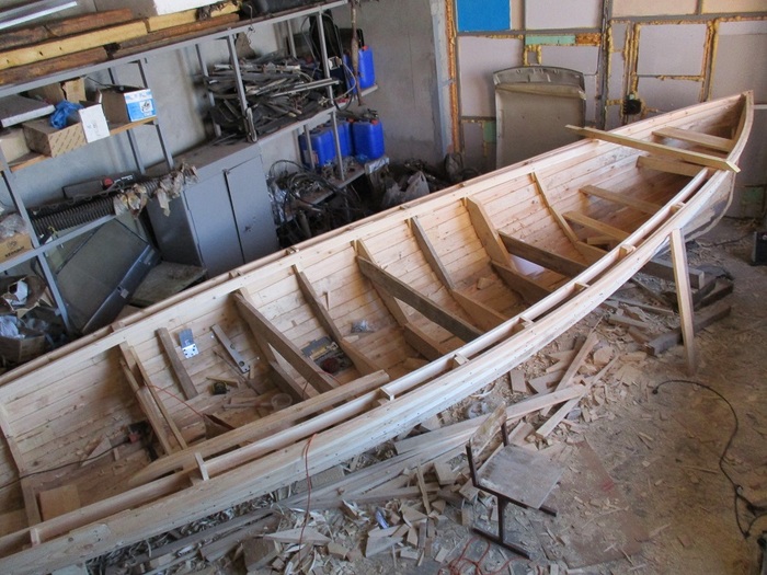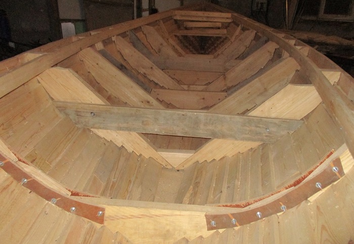 Лодка собиралась килем вниз. То есть сначала был собран киль, прикреплен транец, после чего начал собирать борта. Борта обшиваются от киля вверх, способом "внакрой", то есть каждый последующий ряд (пояс) перекрывает предыдущий примерно на толщину доски.