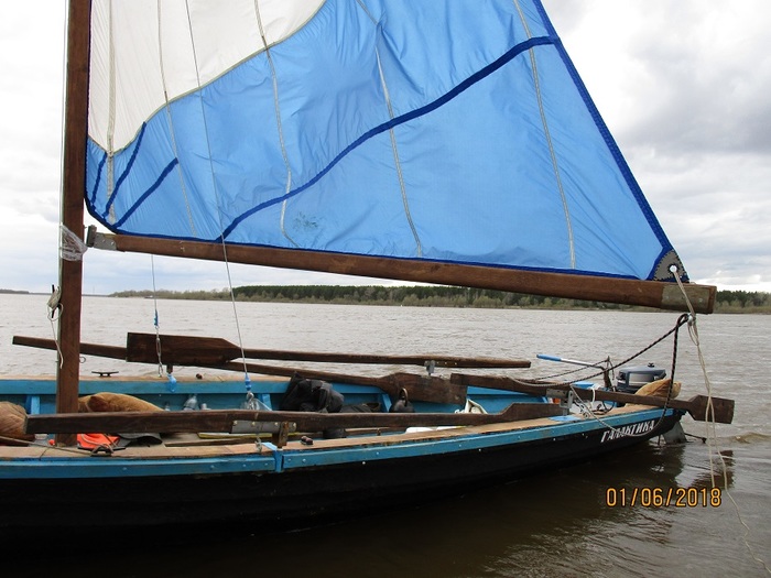 Далее лодка была обработана и покрыта битумной мастикой снаружи. Изнутри окрашена акриловой краской. Также были сшиты паруса, изготовлена мачта, стоячий и бегучий такелаж.