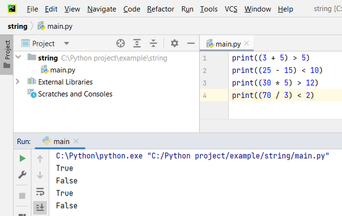 Начнем знакомство с логического типа – Bool, который может возвращать только два значения, True (истина), или False (ложь), рассмотрим на примере сравнения двух чисел: